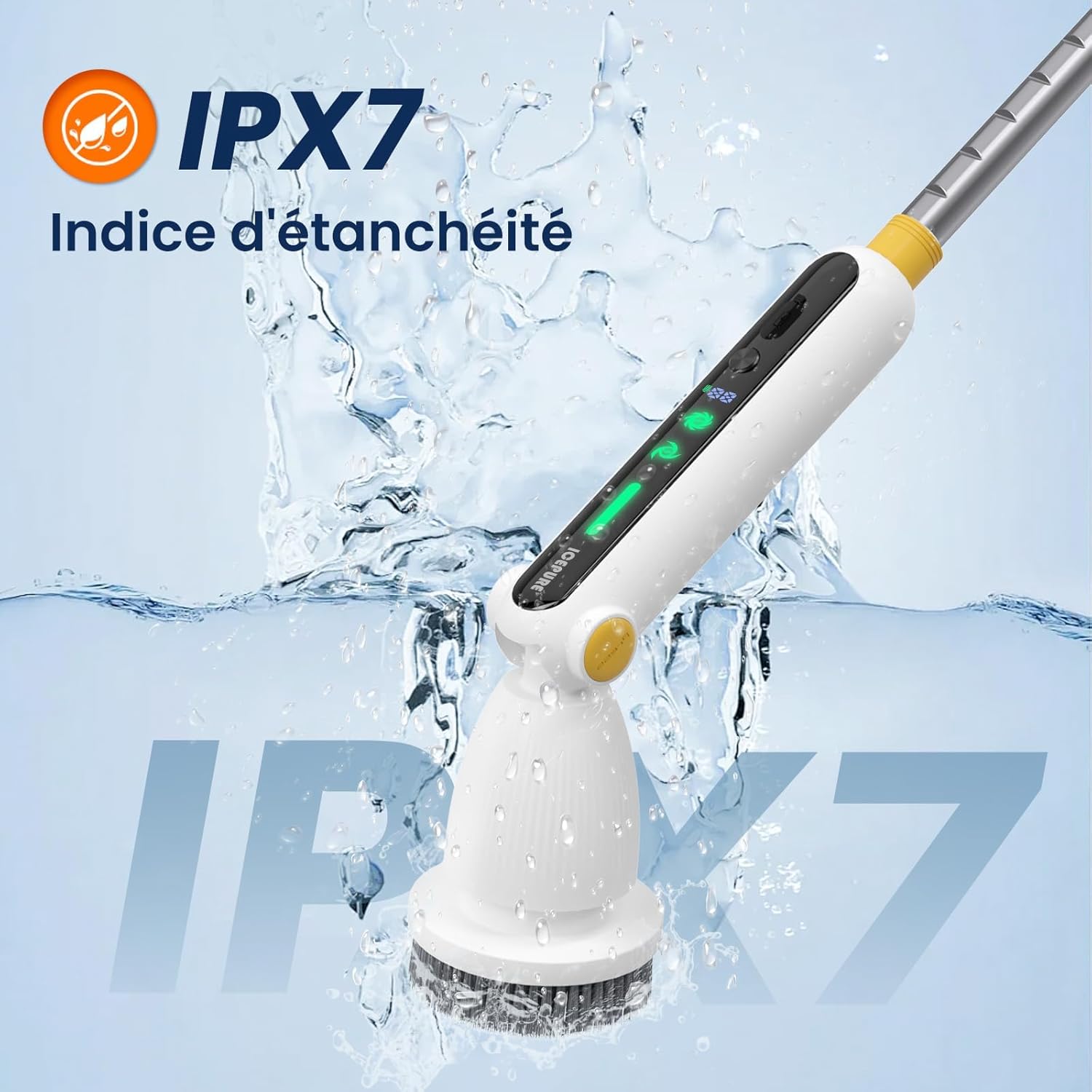 Excelente rendimiento La pantalla LED muestra el nivel actual de la batería para evitar un corte repentino de energía durante el proceso de limpieza. Con 2 velocidades (alta 400 rpm, baja 300 rpm) para satisfacer diferentes necesidades de limpieza. El cabezal del cepillo se puede ajustar en 4 ángulos para limpiar rincones y lugares de difícil acceso sin esfuerzo. IPX7 resistente al agua para un uso seguro en ambientes húmedos.
