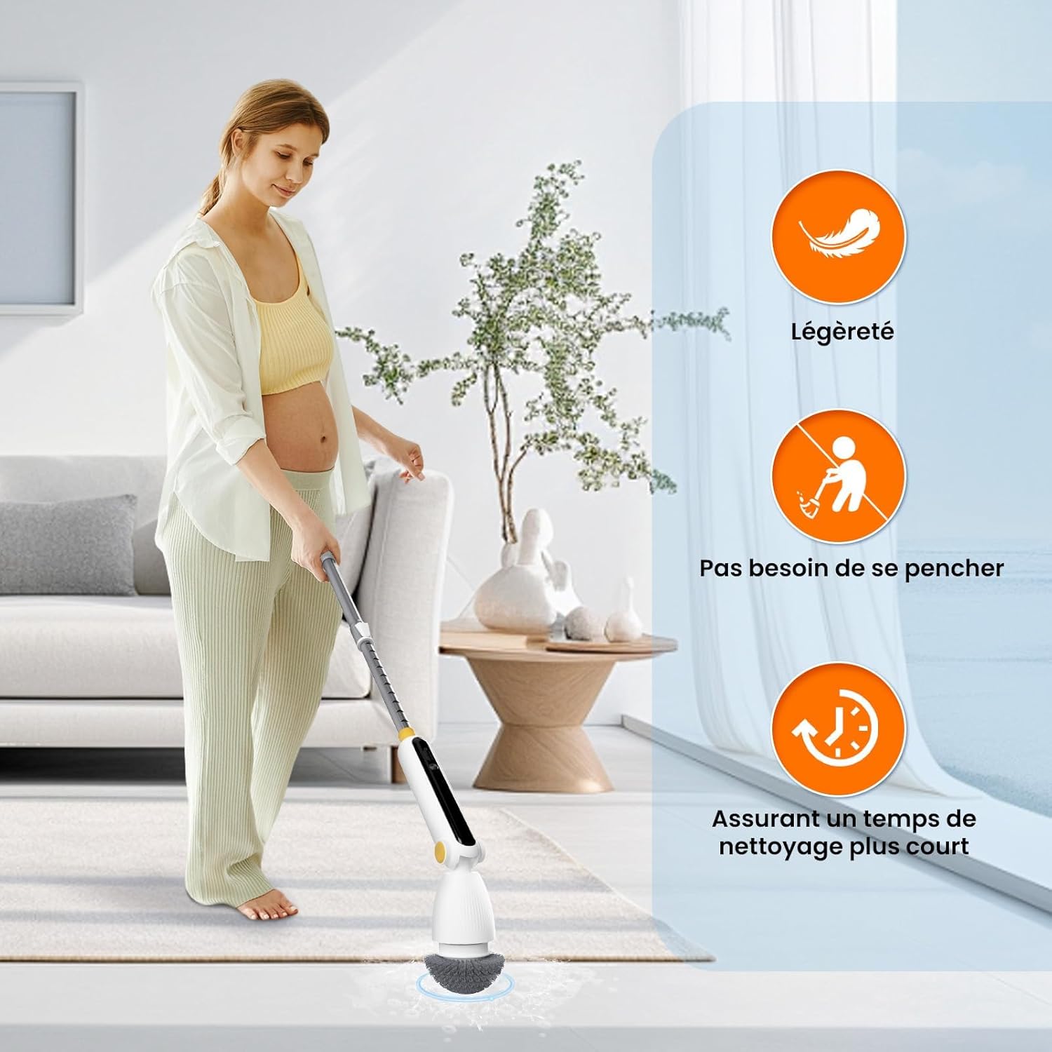 Varios accesorios El producto viene con una variedad de prácticos accesorios que cubren diversas necesidades de limpieza. Incluye 8 cabezales de cepillo diferentes, un cepillo especial para juntas, un mango telescópico ajustable y un cargador. La bolsa de goteo y los ganchos facilitan el almacenamiento de los cabezales del cepillo y los mantienen secos, lo que facilita la limpieza y el almacenamiento después de su uso.