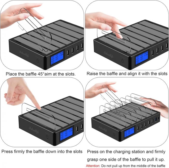 ➢ [Detachable Dividers] The wireless charging station is outstanding with the design of removable baffles. You can easily assemble the detachable baffles by yourself according to your needs, there are two 1.2-inch spaces specifically designed for iPad with cover, thick electronic devices, solving many customer madness problems (even it is a waterproof case or sturdy case), and prevents water splashing or dirt (most charging stations on the market are not allowed)