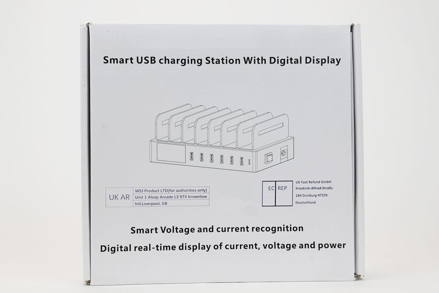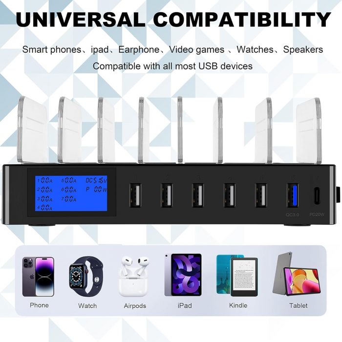 ➢ [Smart LCD Display] The main advantage of this charging station for multiple devices is that it has a smart LCD screen that detects and displays the current rating and charging status for each charging port on the monitor screen. It has a smart brightness driver. The brightness of the screen is controlled by an intelligence controller (dimmed after 30 seconds, off after 10 minutes, with off switch/not), does not affect your sleep