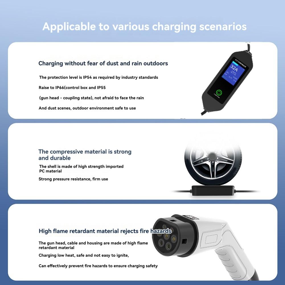 Seguro y fiable: la seguridad es nuestra máxima prioridad a la hora de cargar vehículos eléctricos. Nuestro cargador para vehículos eléctricos está diseñado con múltiples sistemas de protección, como protección contra rayos, protección contra fugas (Tipo A DC6mA), sobretensión, sobrecorriente y conexión, entre otros. El cable está hecho de TPE duradero y de alta calidad, y el conector cuenta con protección IP65 contra el agua y el polvo, lo que hace que este cargador doméstico para vehículos eléctricos sea más seguro y confiable.
