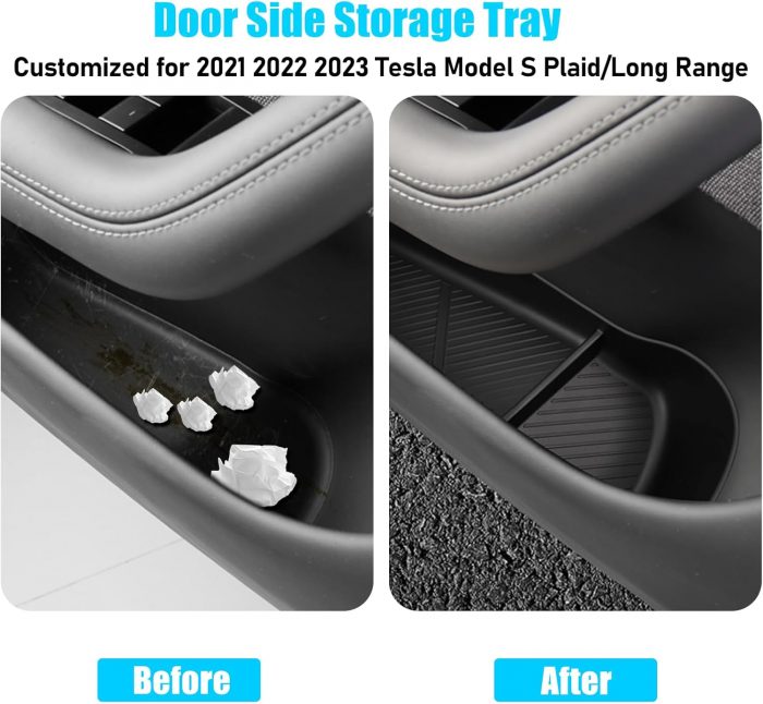 Personalizado para tu Tesla Model S: la bandeja organizadora lateral de puerta modelo S está diseñada para adaptarse a tu Tesla Model S 2021 2022 2023 2024 sin problemas. Su ajuste preciso garantiza que se mantenga estable durante la conducción sin ningún movimiento durante la apertura y el cierre de la puerta. Se adapta bien y cómodo. Mantén tu coche organizado y libre de desorden.
