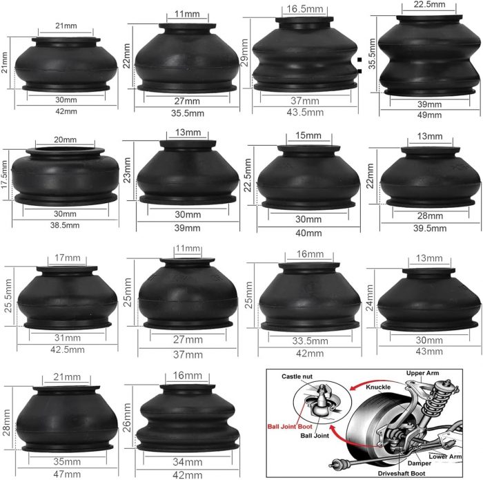 【Package Includes】: Package includes 14 different sizes of dust covers, you can choose according to the size of your car’s tire control arm, which can be used on a variety of vehicles such as vans, buses, cars, taxis and other vehicles, but also meet the daily needs of DIY enthusiasts.