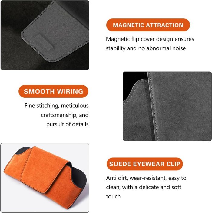 【Material】The eyeglass case is made of luxurious touch lightweight PU leather, soft leather wrapped around the entire glasses clip, soft and comfortable. The inner material is heat and impact resistant, ensuring it won’t damage your visor as well as your sunglasses.