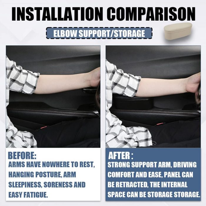 【Soft Material】The top of this left arm elbow rest for car is made of high elastic soft microfiber leather, which feels comfortable and effectively relieves elbow fatigue. The bottom is made of plastic, which can help store small items and is sturdy and durable. This product does not affect the normal opening and closing of the door, which is a very human design.