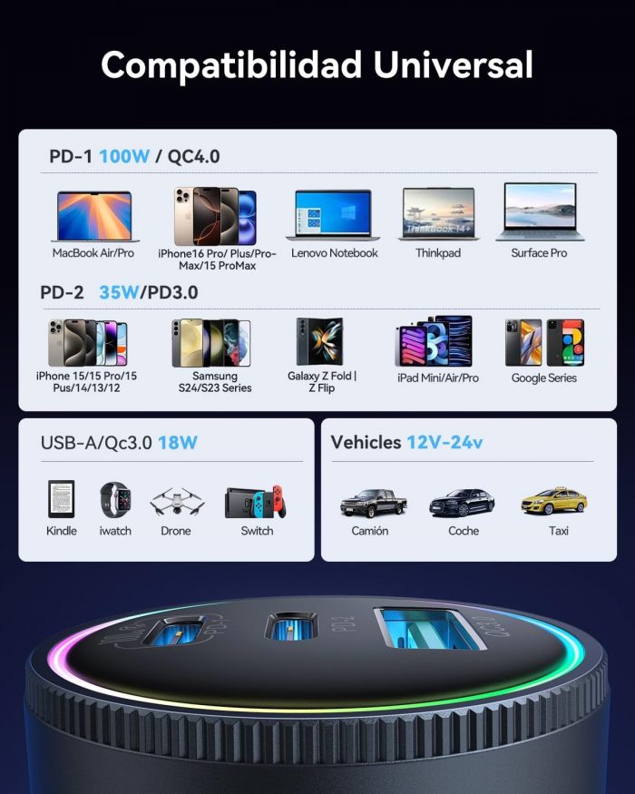 【Universal Solution】Automatic detection of devices (iPhone17/16/15, Samsung S25/S24, phones, laptops, dashcams) with power optimization. Compatible with 12V-24V vehicles (SUVs, trucks, motorhomes) and +100 USB devices. Even with standard 12V vehicle voltage, the adapter generates output up to 20V – ideal solution for charging laptops on long journeys