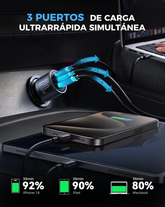 【120W Ultra-fast Charging】This car charger supports PD 3.0, QC 4.0, QC 3.0 and PPS with maximum power of 120W. PD-1 port support iPhone 16 Pro charging technology (15V/3A 45W): 92% in ~35 minutes. MacBook and iPad Air reach full charge in ~50 minutes