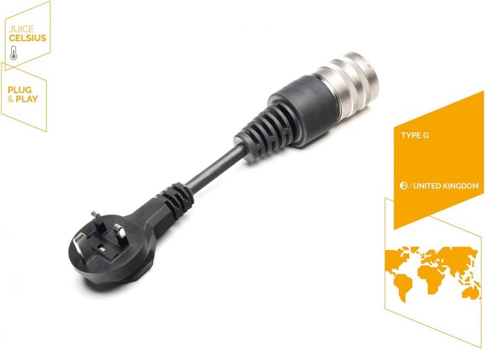 CAR PLUG ADAPTER TYPE G (UK): Combine this JUICE CONNECTOR adapter with the Policharger JUICE BOOSTER, to charge your electric vehicle in any UK household plug