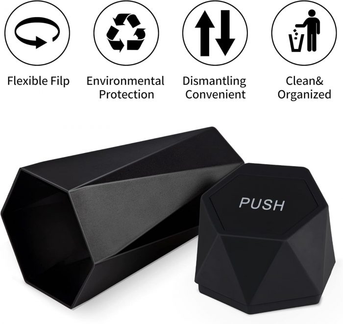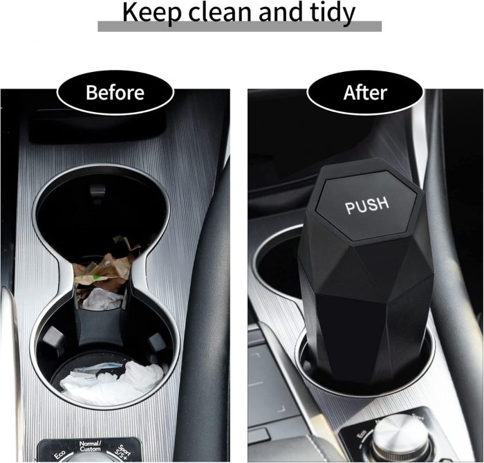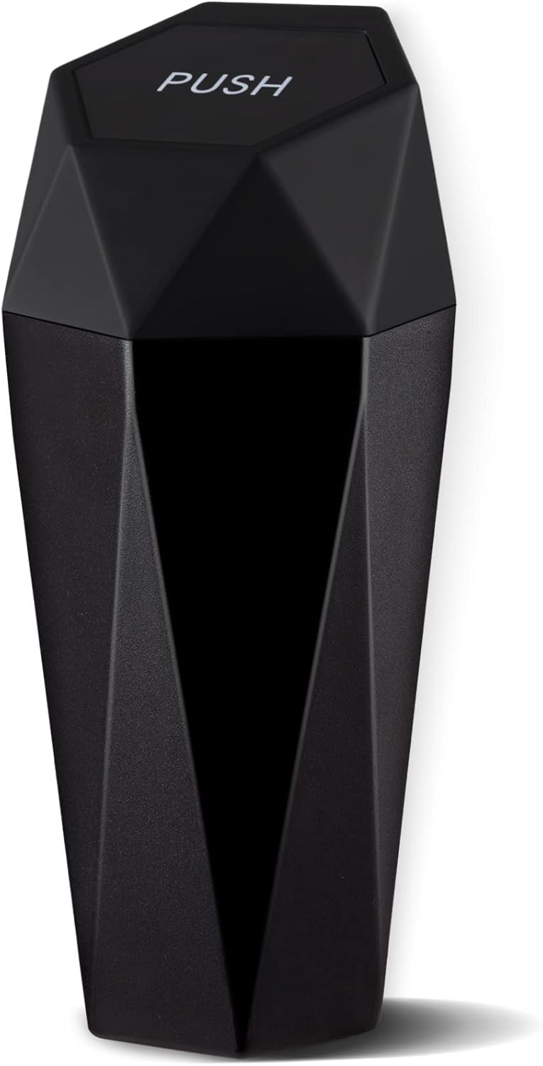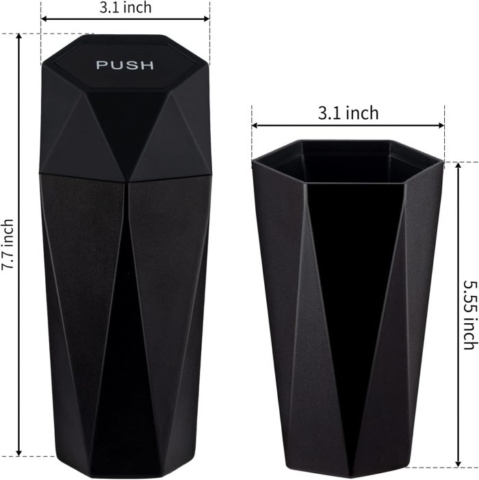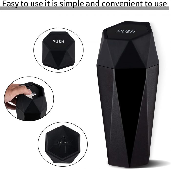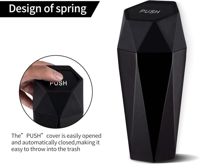 COOL APPEARANCE Diamond cutting surface design, simple, elegant and fashionable, not only practical, but also can play a decorative role. SPECIAL DESIGN Easy to bounce cover design, push cover easily opens and closes automatically, easily throws into the trash. Practical: Made of environmentally friendly plastic, it can not only be filled with garbage, but also has good waterproof function, strong and durable, and can be cleaned by opening the lid. Multifunction: It can be placed in the cup holder or car door, can be used as a desktop trash can, and can also be used as an ashtray, suitable for cars, homes, offices, etc.