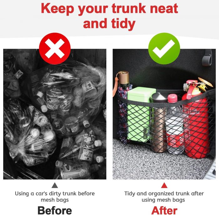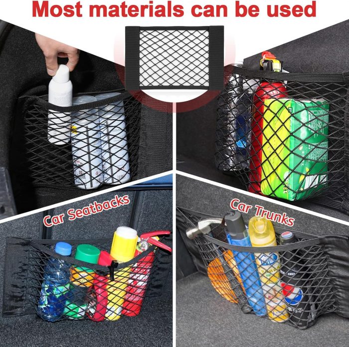 Applicable A: Car storage nets can also be flexibly used for storage between seats, on the side windows, on the back of the car or anywhere else with adhesive tape, and even compatible with RVs, vans and other types of vehicles, truly achieving «a bag for multiple uses», maximizing the value of every inch of the trunk space