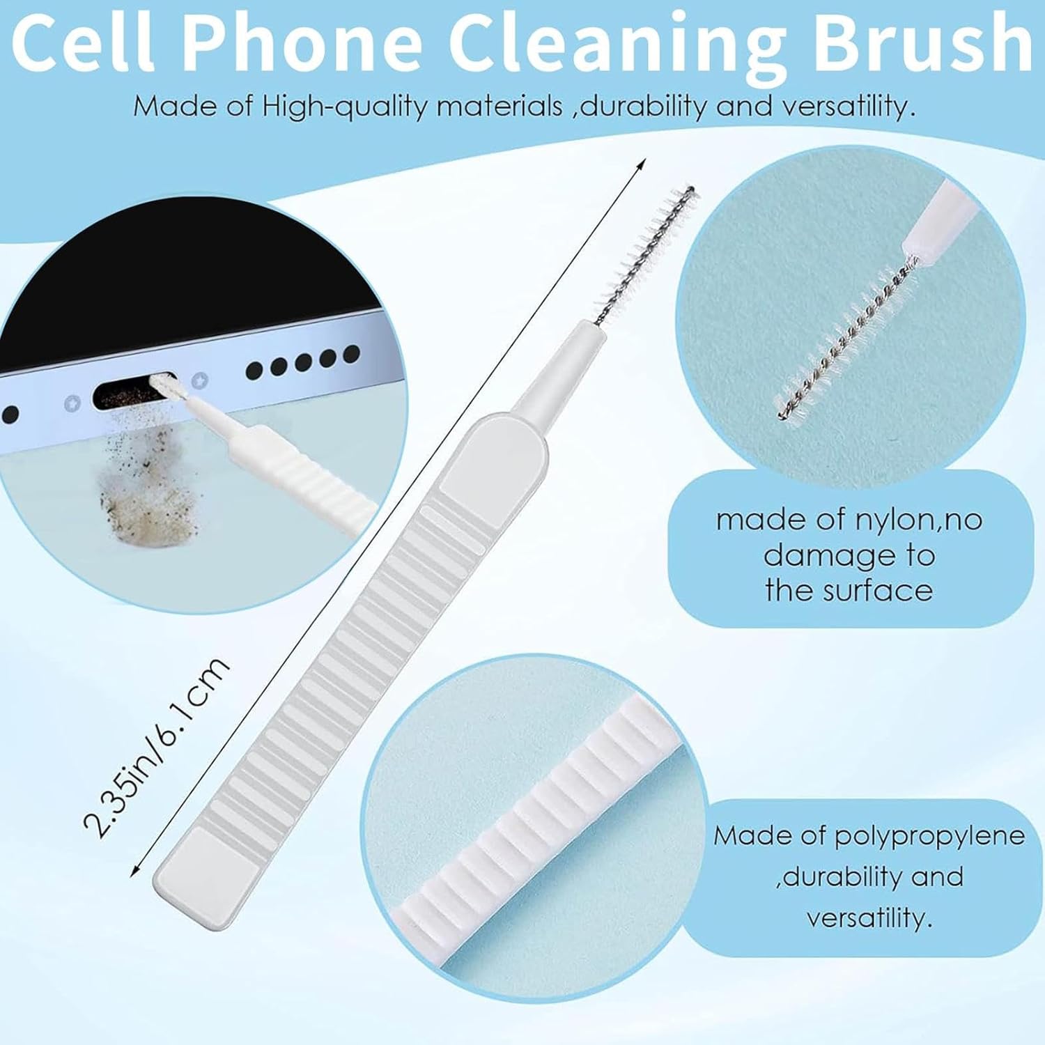 Diseño duradero: mantenga los puertos de su teléfono limpios y libres de residuos durante mucho tiempo con nuestro kit de limpieza. Con un mango de PP resistente al desgaste y cerdas de nailon resistentes, este kit está diseñado para durar incluso con un uso prolongado.