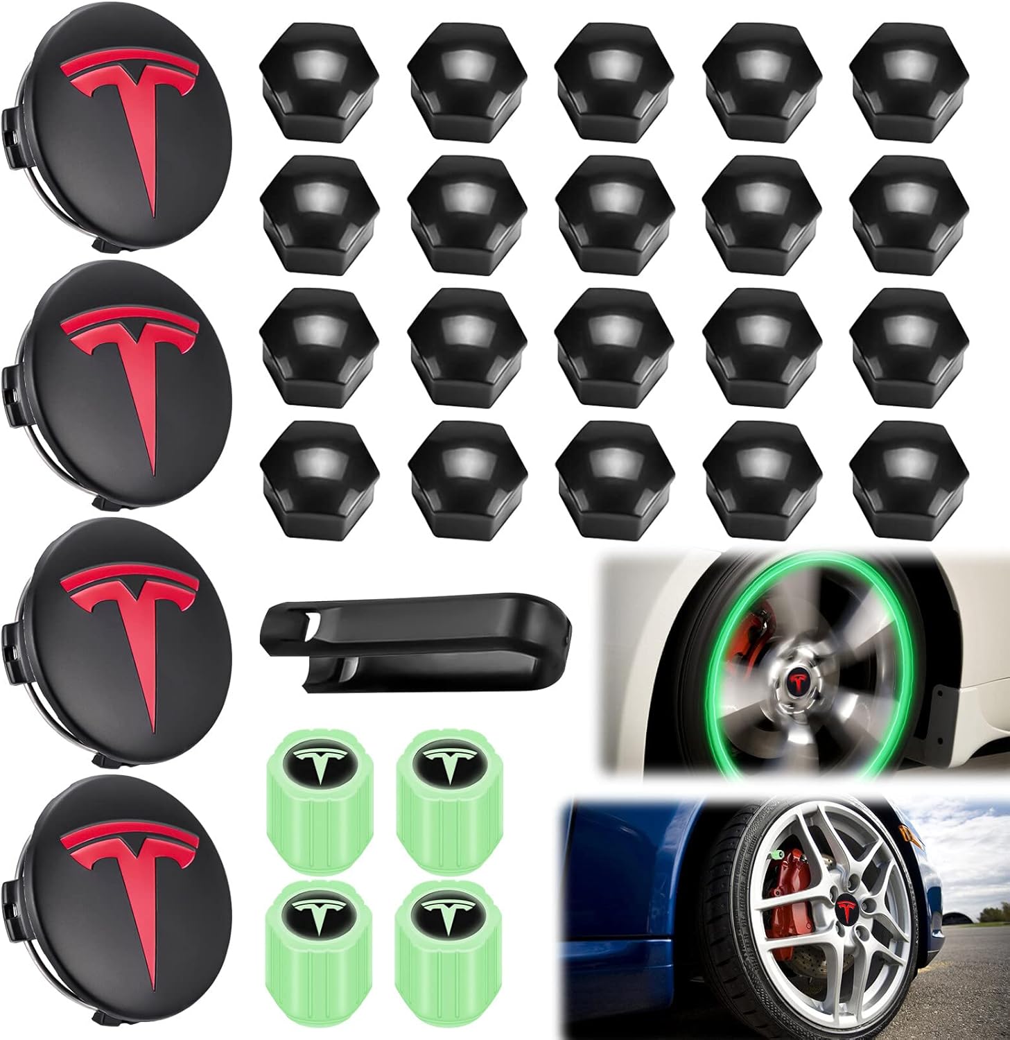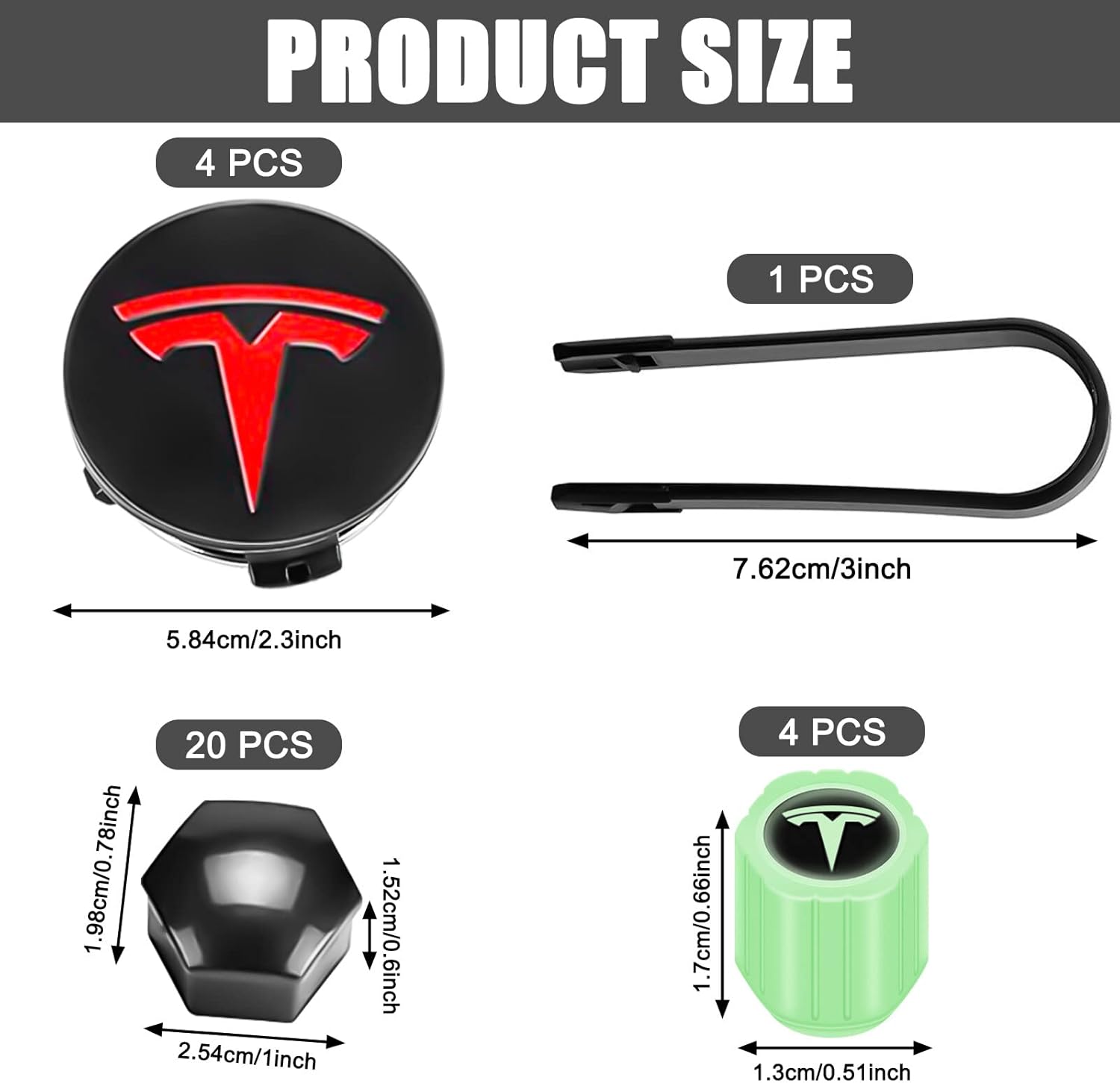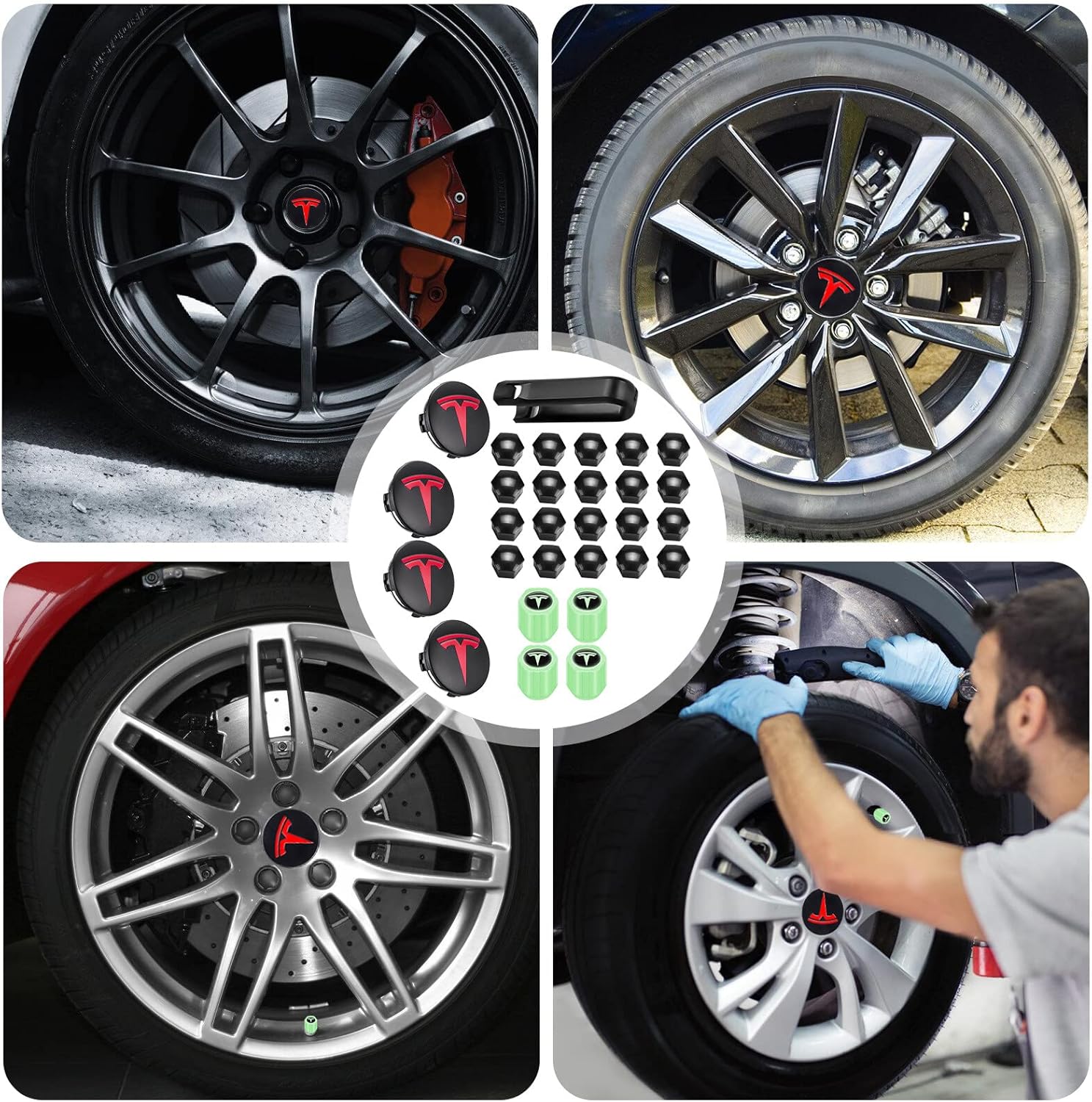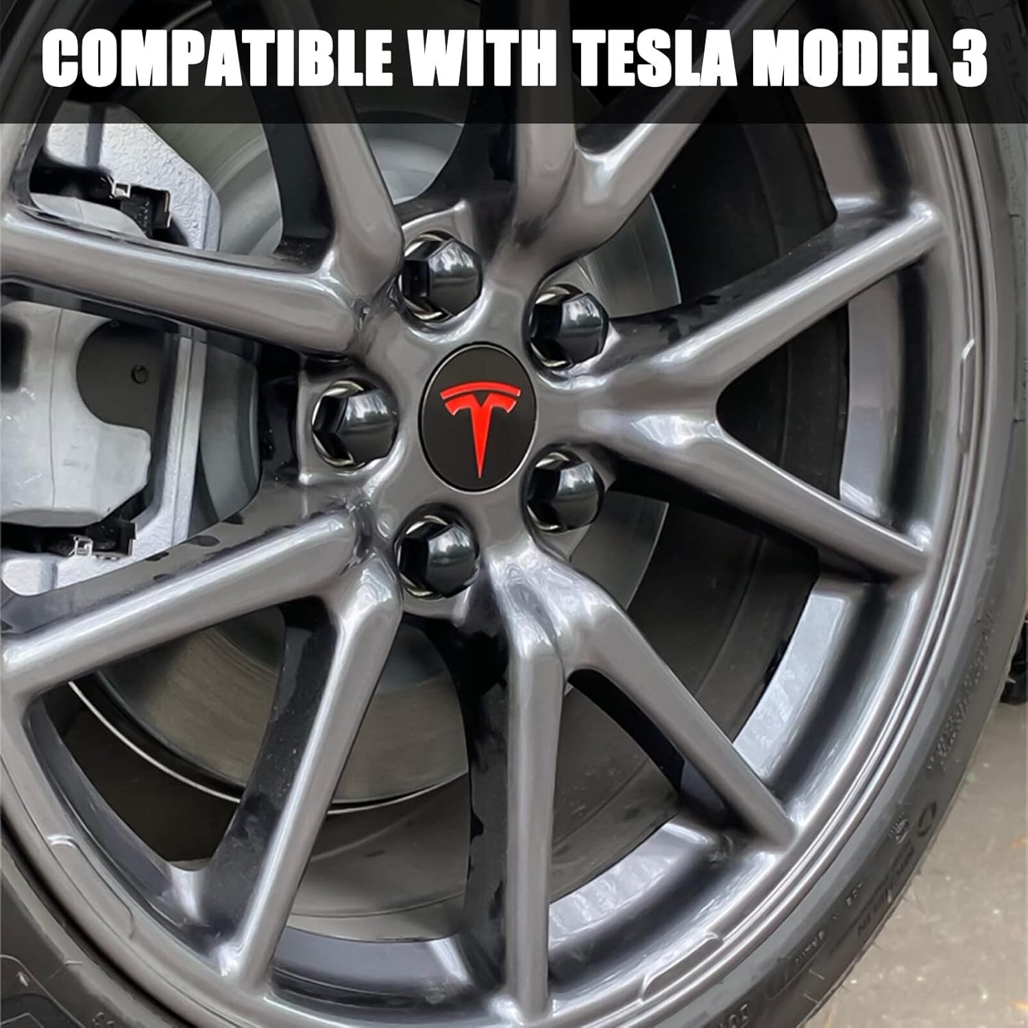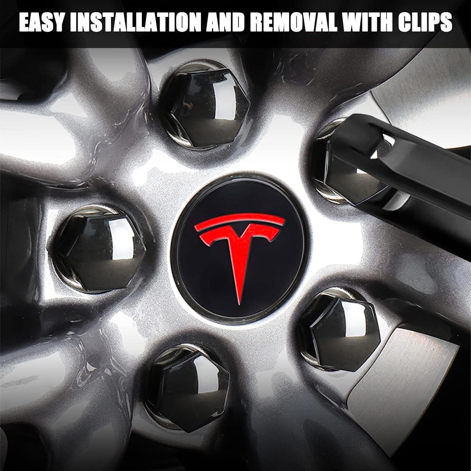 JUEGO DE TAPACUBOS VISUAL TESLA: El juego de tapacubos aerodinámico mejora el aspecto de su automóvil con colores vibrantes y textura sólida. El logotipo de la tapa del cubo central de Tesla es rojo y las tapas de las tuercas son negras.
