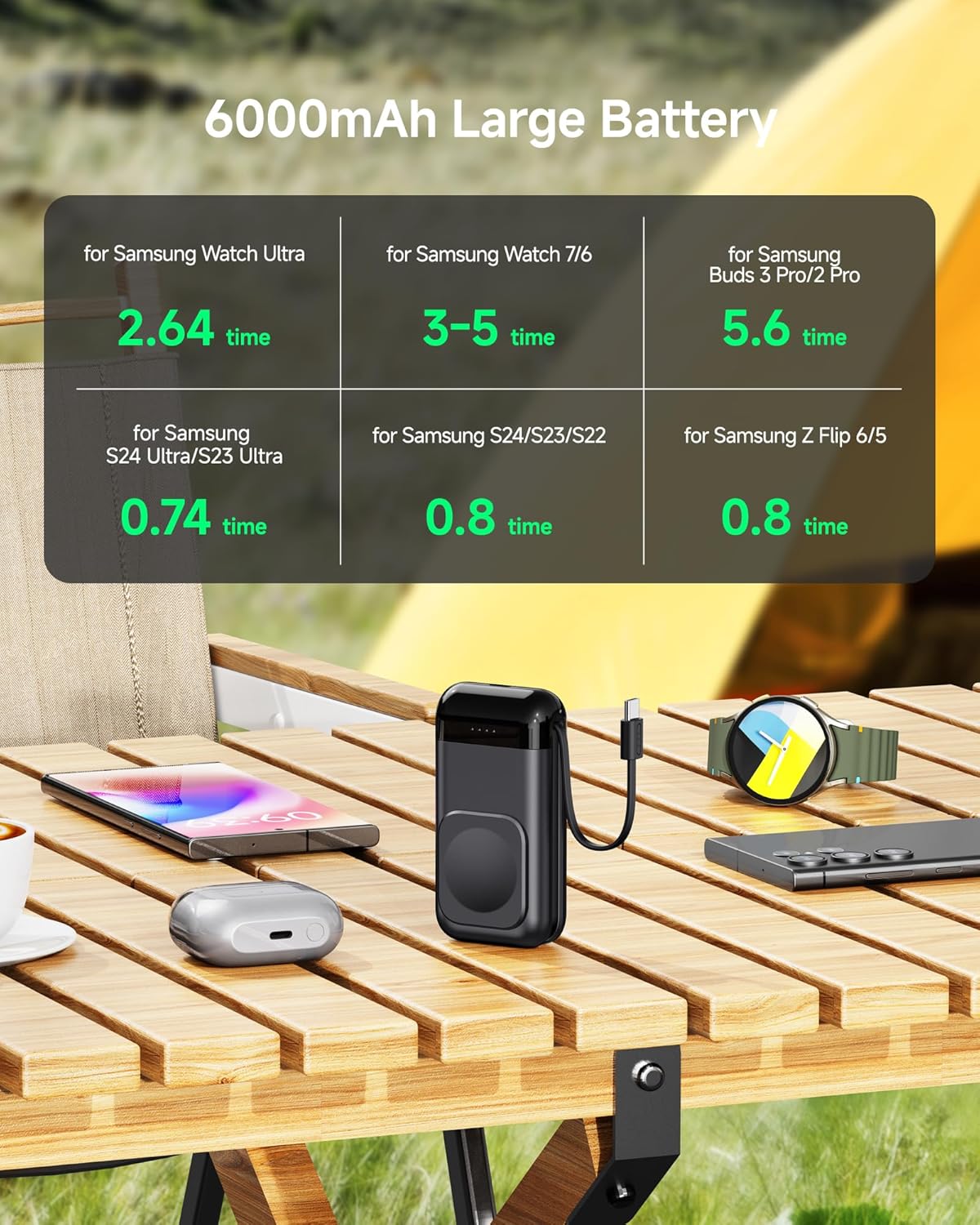 【6000mAh Large Capacity Battery】Built-in magnetic charger module, this 6000mah portable samsung watch charger can charge the galaxy watch 10 times, for Samsung S22 about 1 time and for Galaxy Buds about 8 times. This samsung watch charger is lightweight and compact, you can easily hold it in your hand, put it in your pocket or purse, best galaxy watch charger indoor and outdoor for emergency use, anywhere charge.