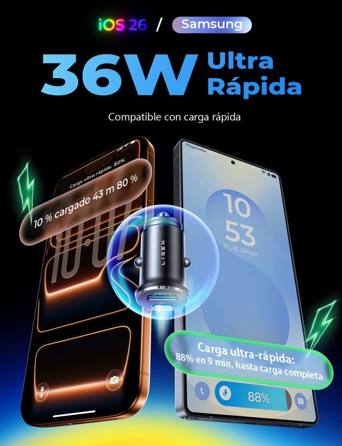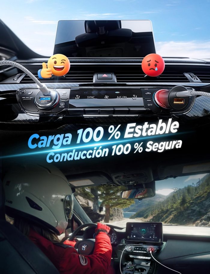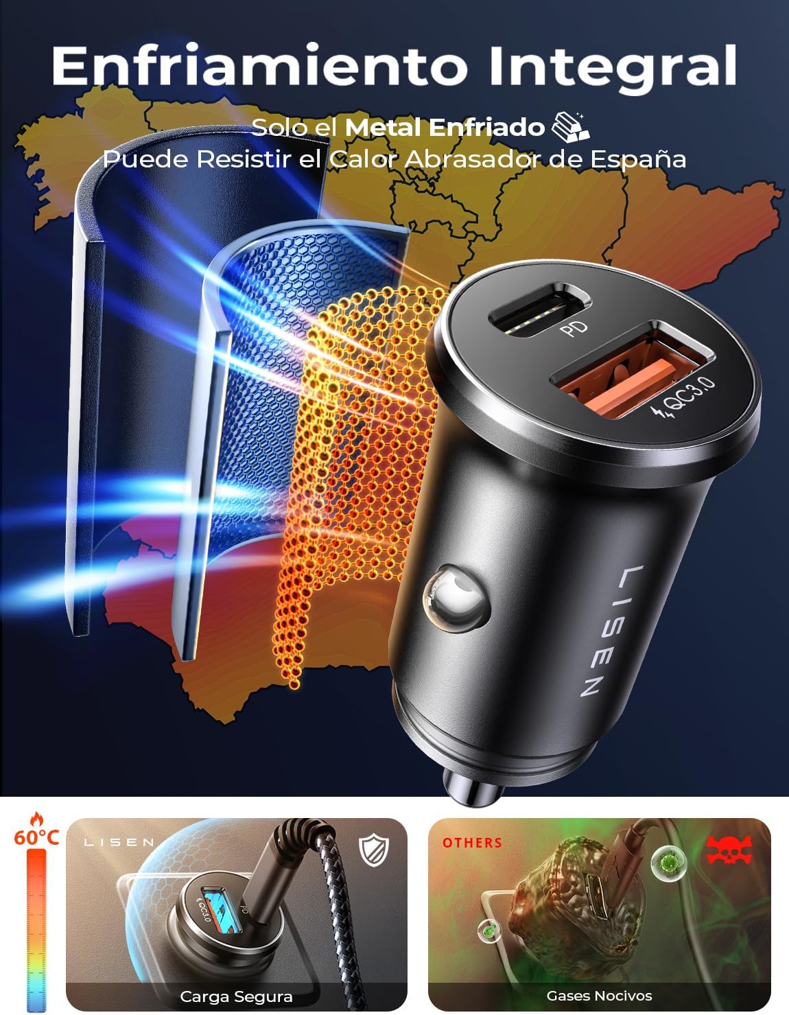 【Metal Coolant】: The LISEN car charger has an all-metal structure, which guarantees its suitability for intense and prolonged high temperatures in Spain. This all-metal structure avoids the risks of product melting or internal structural changes caused by high temperatures inside the vehicle. Even in environments exceeding 60 °C, it does not release harmful gases like the plastic cart isqueiro cart.