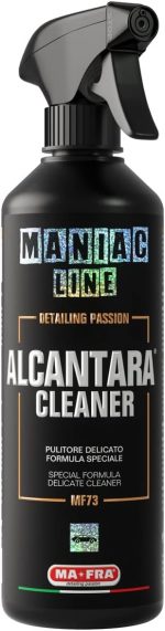 Specific cleaner for Alcantara: Alcantara Cleaner Maniac Line by Mafra is a specific cleaner, approved by Alcantara, designed to maintain the softness and original color of the fabric without fading. Ideal for frequent car interior cleaning, effective on stubborn stains and mixed dirt. Its mild anti-odor formula can also neutralize bad odors and release a clean fresh fragrance on treated surfaces.