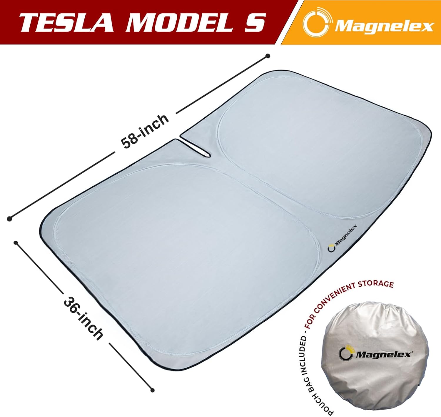 Enjoy the convenience of boarding your Tesla Model S without breaking a sweat when you equip it with a Magnelex front windshield sunshade. This reflective sun block installs inside the front window glass, deflecting UV rays and reducing the interior temperature of your car while parked. When you return to your vehicle after working all day, the interior of the passenger compartment will be cooler and more pleasant for your journey. With upholstery and interior surfaces protected against fading and cracking, your purchase value may also be higher in the future. The star product of your car, Magnelex sun shade for car windows fits snugly on the windshield because it has a unique cutout for the rearview mirror pole. This allows it to block more UV rays than other windshield shades for greater cooling potential. High tension ductile wire around the edge of the windshield shield customizes the fit to your window glass for a secure and firm fit. Park your car, place the Magnelex Window Sunblock in place and you will be sure that your car will be comfortable on your return. Each includes a free carry bag in which it folds flat to store in the trunk or under the seat between uses. Made with durable, high-quality UV reflective material that stands up to countless uses without fading, Magnelex car shades will be long-lasting additions within your car accessories. Enjoy the most comfortable ride in the sun. Add the windshield shade to top your car and truck accessories today!