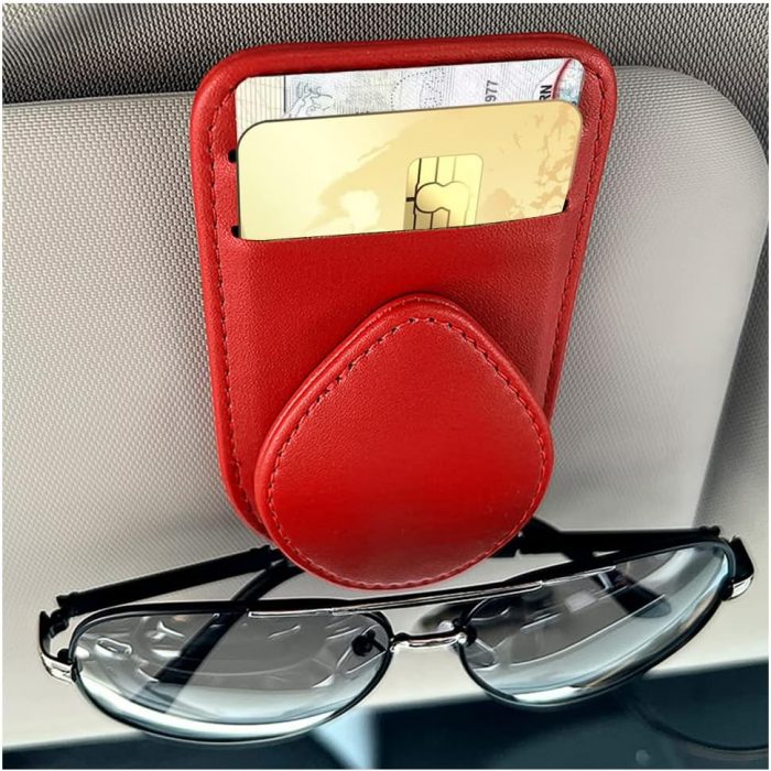 Magnetic Glasses Holder for Car, Multipurpose Leather Car Glasses Holder with 2 Card Slots, Elegant Interior Car Accessories to Store Glasses, Sunglasses, Cards (Red)