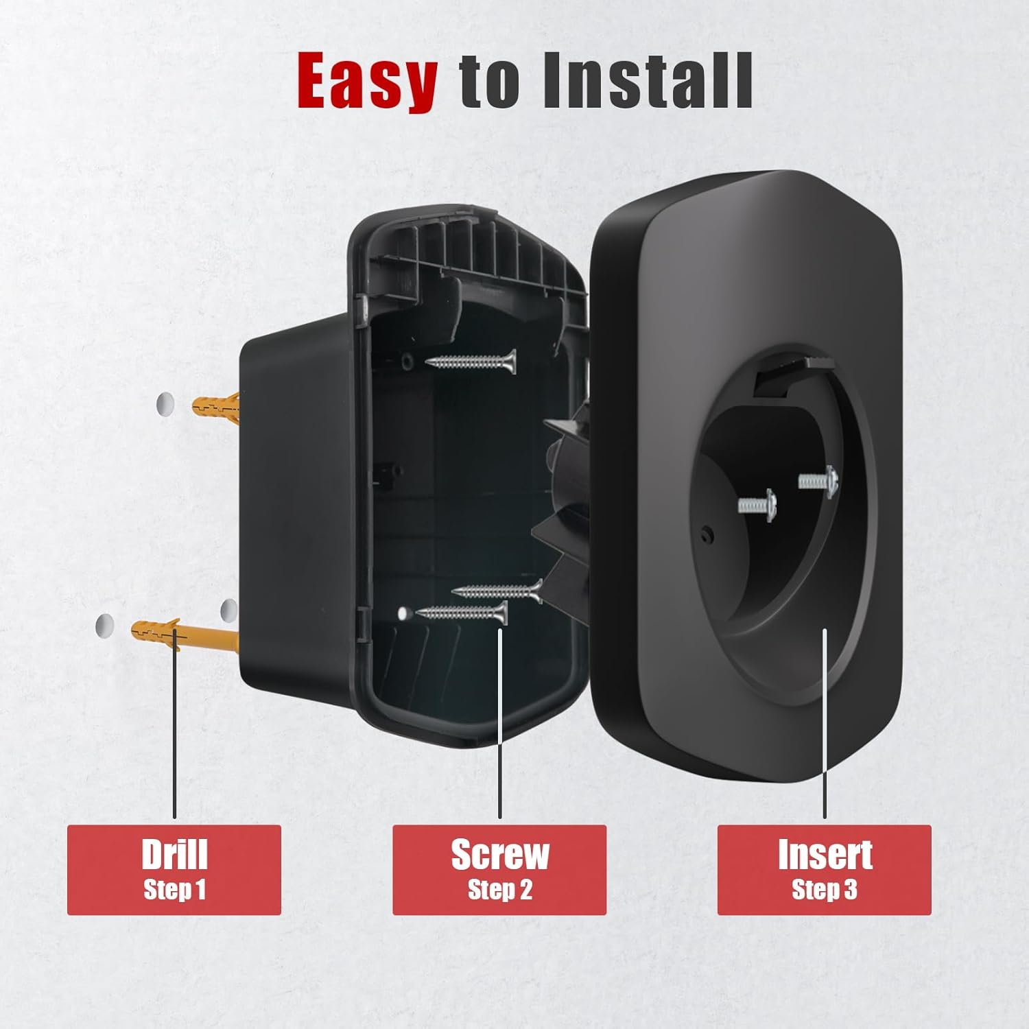 Instalación sencilla: El soporte del cable de carga tipo 2, después de fijar el soporte con los 3 tornillos y 3 tacos incluidos, cubre la carcasa y asegúrala aún más con 2 tornillos cortos. Esto completará la instalación. Este soporte es más estable que los soportes adhesivos y puede soportar aproximadamente 10 kg de peso.