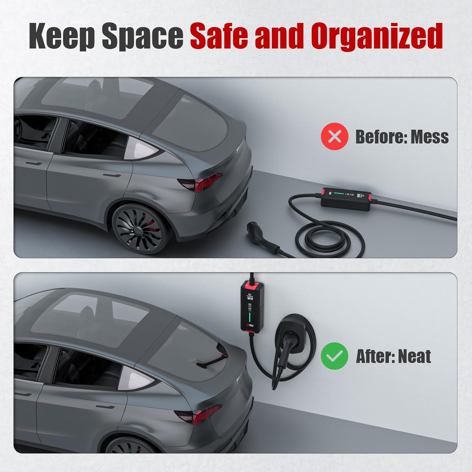 Ahorre espacio y manténgalo ordenado: este soporte de pared está inclinado para proteger mejor el enchufe de la lluvia y el polvo. Puede contener hasta 10 metros de cable manteniendo el enchufe del cable de carga tipo 2. De esta manera, mantendrá limpio el cargador de su vehículo eléctrico y organizado su garaje.