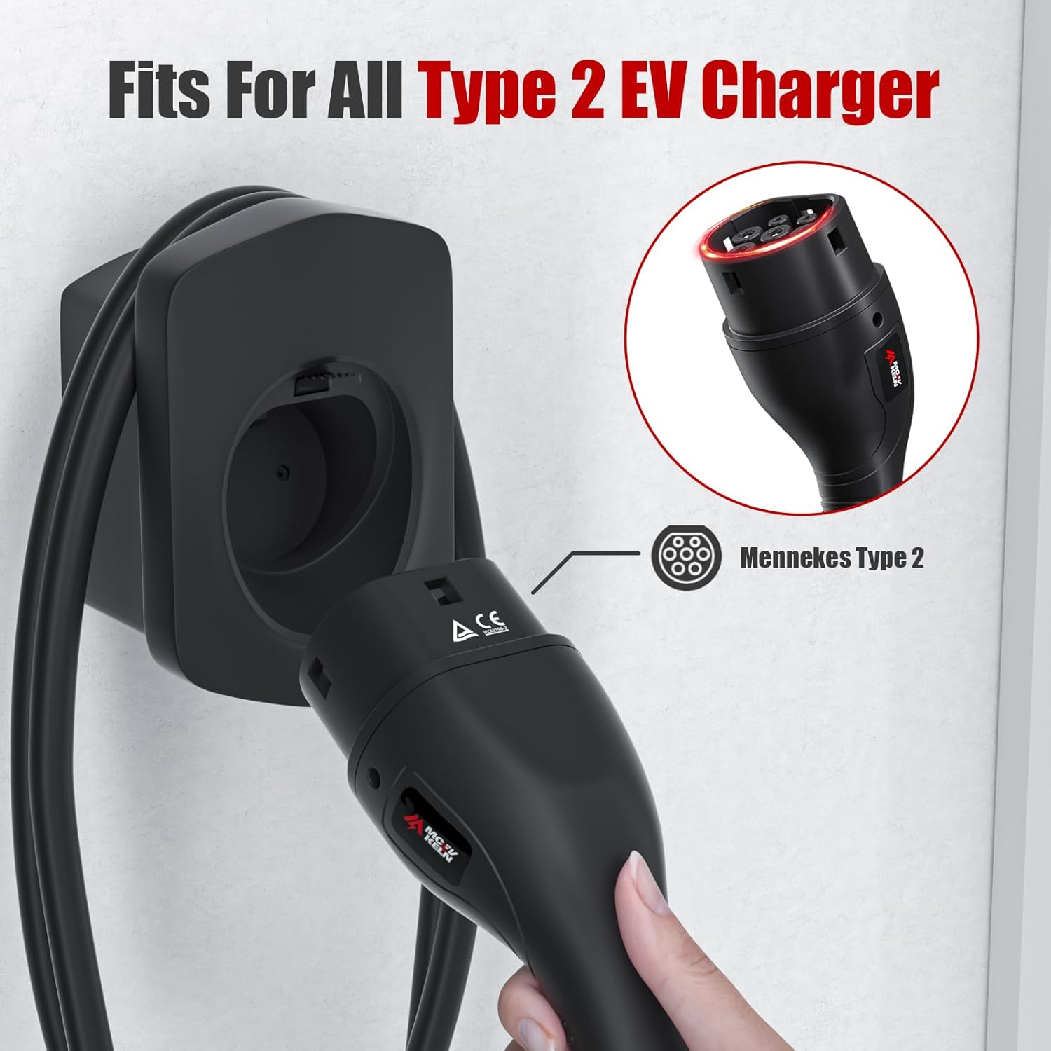 Diseñado para enchufe tipo 2: el soporte está diseñado de acuerdo con IEC 62196-2 (Mennekes), el estándar europeo universal para puertos de cables de carga de automóviles eléctricos. Es compatible con todos los vehículos eléctricos Tipo 2 en Europa.