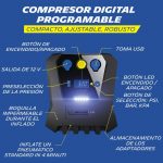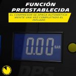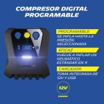 Compresor digital de 12V/programable. Inflado de un neumático estándar en 3 minutos.