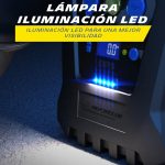 Lámpara de iluminación LED. Toma USB de 12V para alimentar dispositivos electrónicos. Almacenamiento para manguera de inflado. Manguera de nailon de 60 cm.