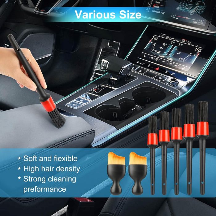【Quality Material】: 5 pcs car cleaning brush in different sizes are made of synthetic fiber mixture, strong cleaning performance, flexible and burr-free, suitable for wet and dry use. 2 pcs car interior detailing brushes are composed of high-quality synthetic fiber, fast dust removal, fluffy and soft, not easy to fall off. In order to avoid scratches, we have no metal parts composition in the auto detail brush.