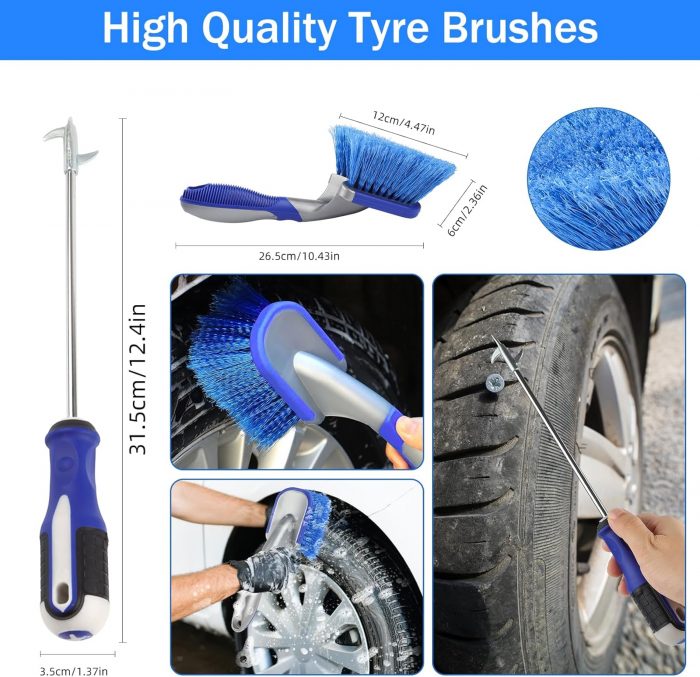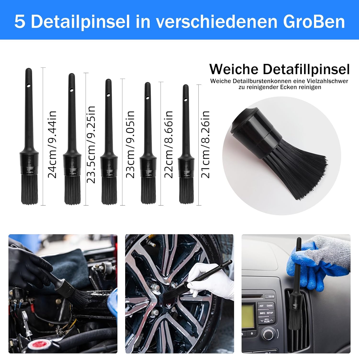 🚗【Multi-purpose Car Cleaning Set】31 pieces car detailing set, which includes 5 car detailing brushes, 5 sets of drill brushes, 1 extension rod, 3 wire brushes, 2 drill polishing sponges, 1 suction cup, 1 dusting duster, 1 car wash gloves, 2 wax sponges, 1 cleaning cloth, 1 storage bag, 1 brush for cleaning hollows, 1 brush For tires, 1 air conditioning vent brush and replacement, 1 stone removal hook, 1 towel, 1 water absorbent sponge, 1 short handle brush.
