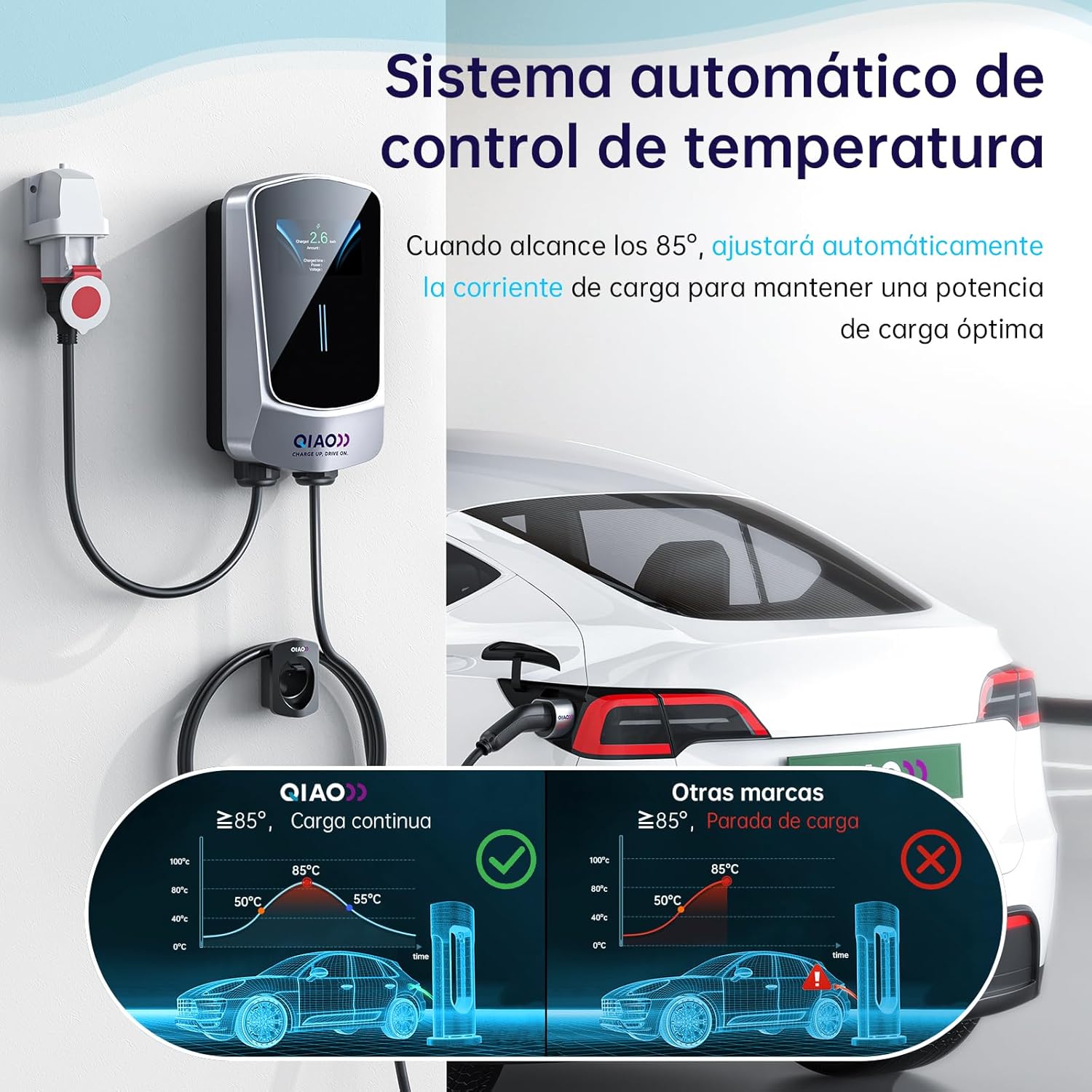 Ajuste automático de la potencia de carga de los vehículos eléctricos: – Para garantizar una carga segura y continua, cuando la temperatura interna de esta estación de carga alcance los 85 grados, el cargador QIAO )) EV Tipo 2 ajustará automáticamente la corriente de carga para mantener la potencia de carga óptima para sus vehículos eléctricos. (Notas: la mayoría de los cargadores de vehículos eléctricos dejarán de cargarse cuando la temperatura interna supere los 85° en el mercado).
