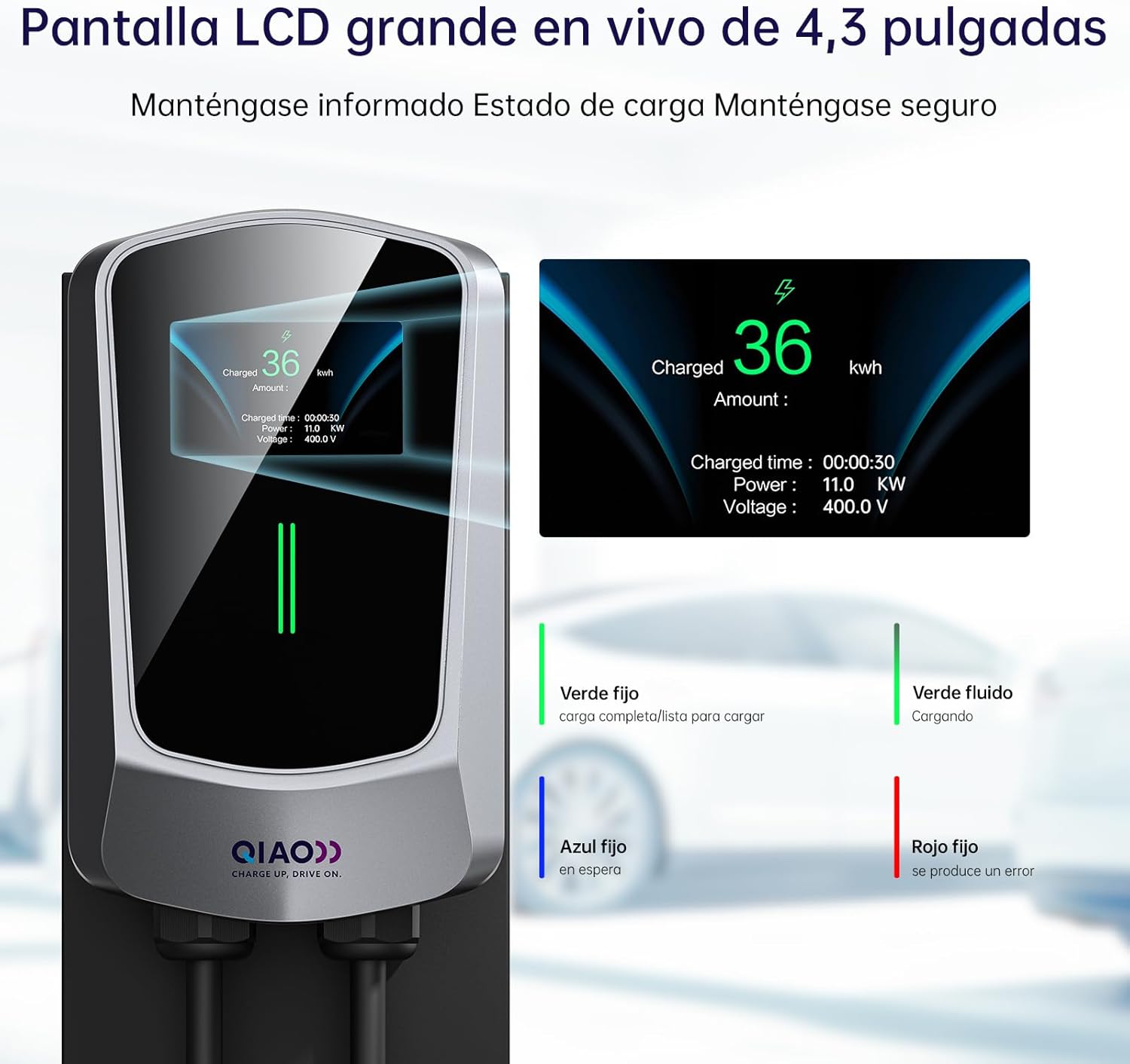 QIAO)) Cargador EV tipo 2 de 11 kW, aplicación inteligente trifásico 8-16 A, estación de carga para vehículos eléctricos de montaje en pared con pantalla LCD de 4.3, cargador de pared para vehículos eléctricos doméstico IEC 62196-2 tipo 2 a enchufe CEE 16 A con soporte para cables