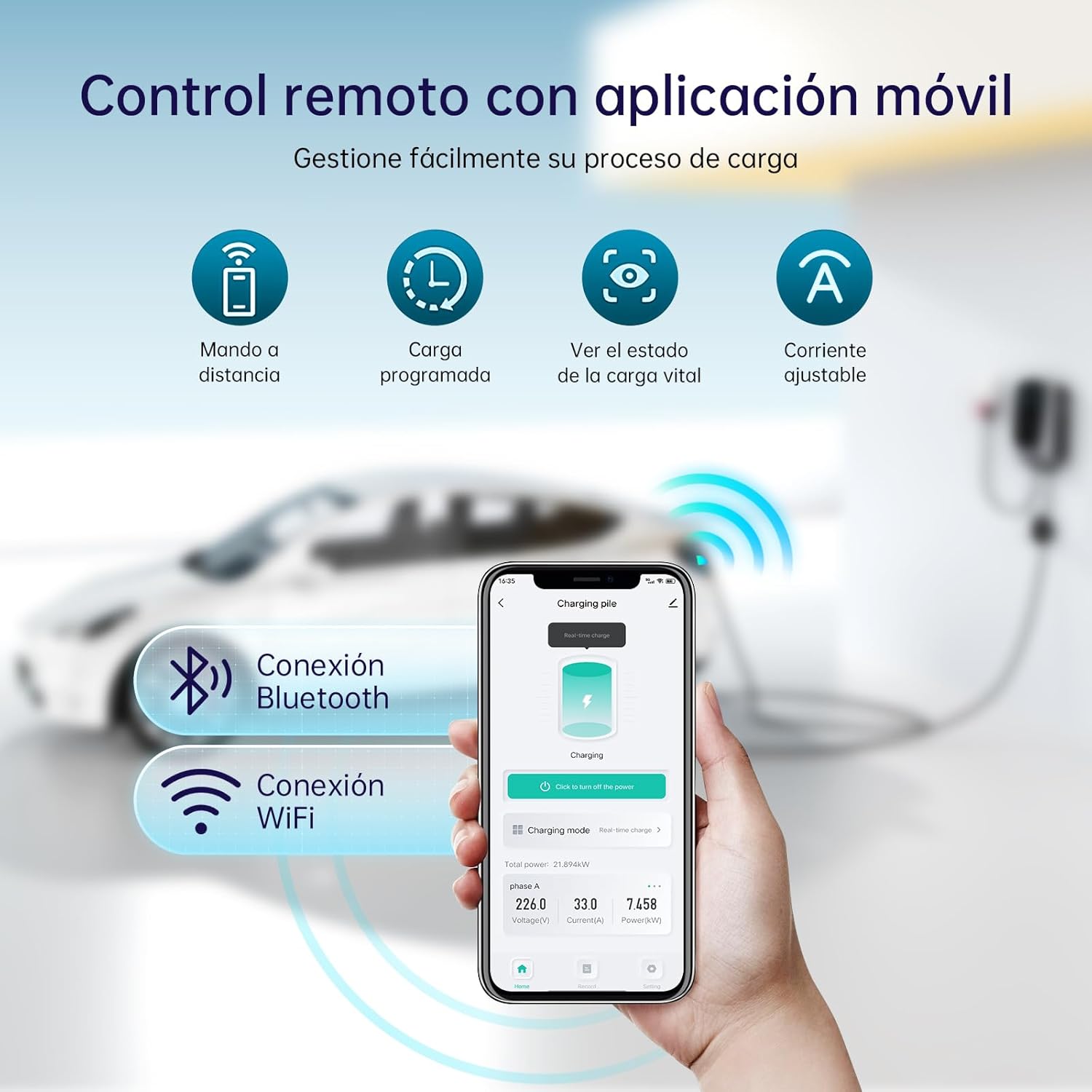 Control remoto de aplicación inteligente: – Después de configurar su estación de carga EV a través de WiFi de 2,4 GHz y Bluetooth, puede controlar de forma remota, monitorear el estado de carga, ajustar la corriente de carga y ver el historial de carga a través de nuestra aplicación. También puede programar la carga con anticipación para optimizar los costos de energía al cargar su vehículo durante períodos de tarifa reducida. Manténgase informado sobre el consumo de energía de su vehículo y cargue de manera eficiente, ¡incluso cuando esté lejos de su vehículo!
