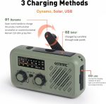OPCIONES DE CARGA DE 3 VÍAS: una radio portátil con múltiples opciones de carga de respaldo es la opción ideal. Las 3 opciones de carga incluyen una entrada de alimentación USB de 5 V CC, manivela y panel solar, que es más potente y confiable, lo que garantiza que la radio de emergencia siempre estará disponible para usted.