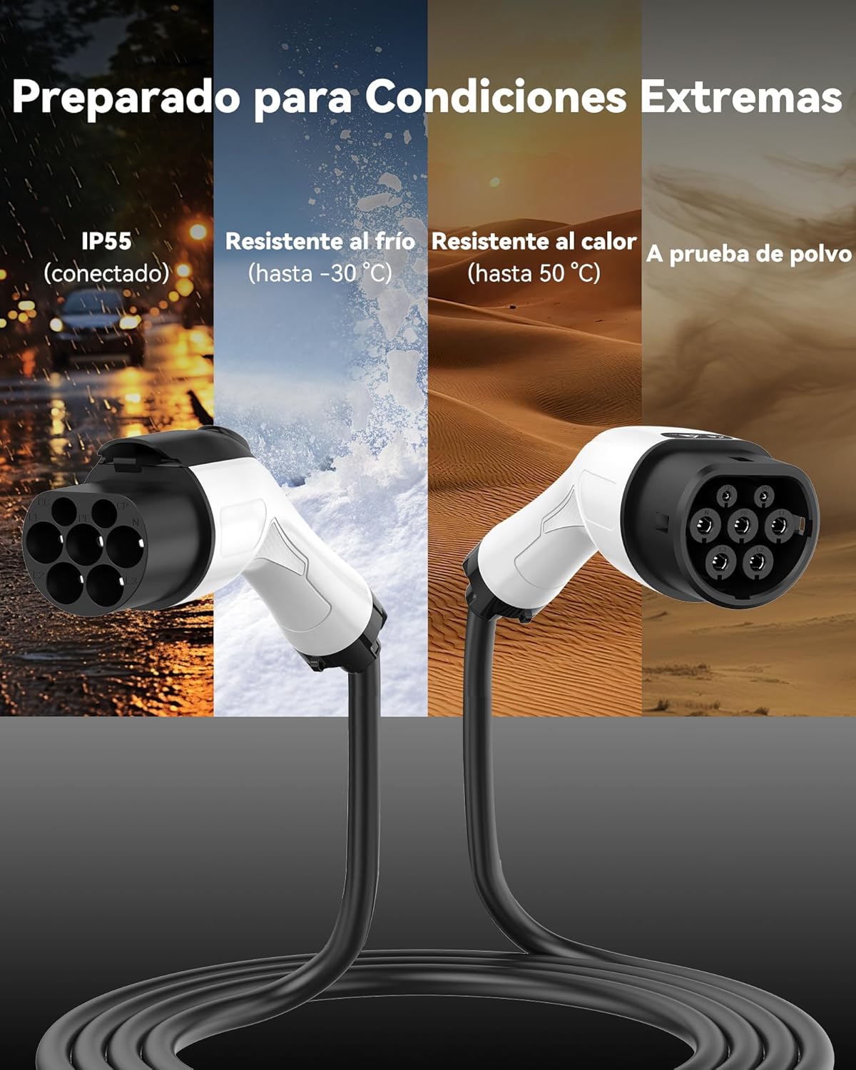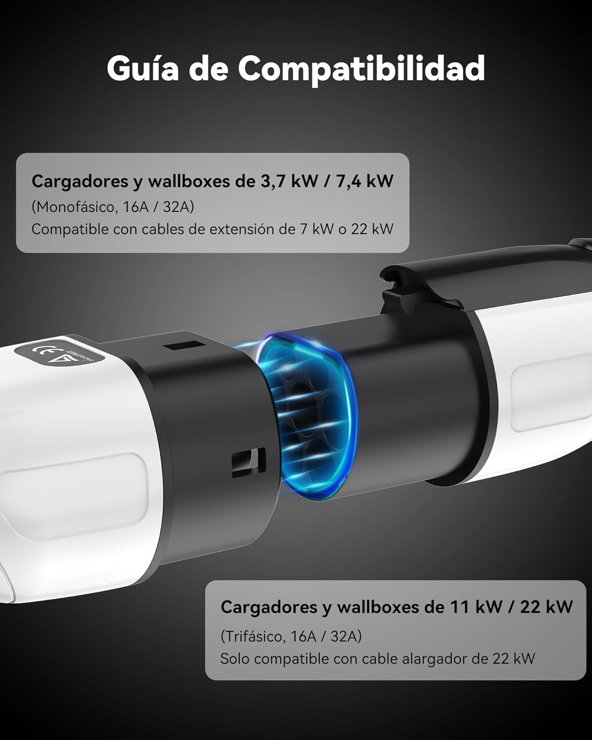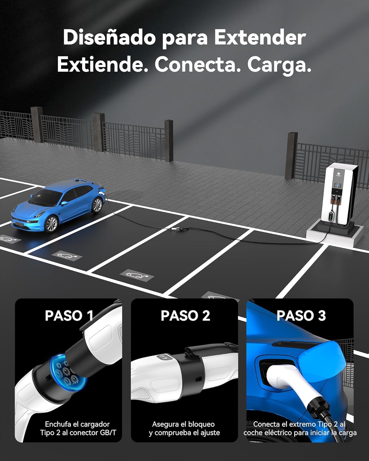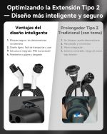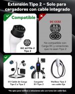 Compatibilidad universal: Totalmente compatible con cargadores VE, estaciones de carga y Wallbox para ampliar la distancia de carga con facilidad. Diseñado específicamente para todos los vehículos eléctricos (VE) e híbridos enchufables (PHEV) con conectores Tipo 2 o CCS2, garantizando una carga estable y segura en cualquier situación.