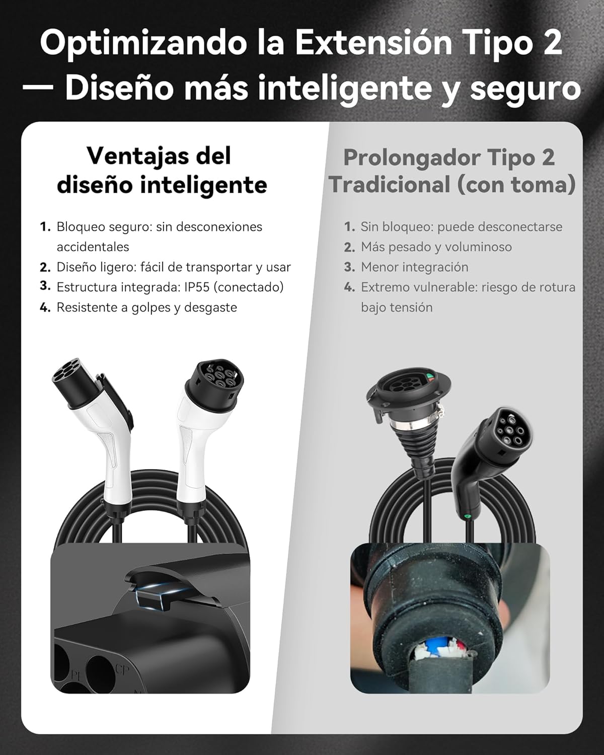 Función de bloqueo de seguridad: el diseño integrado con mecanismo de bloqueo especialmente diseñado garantiza una carga segura. Construido para durar, el cable de extensión es robusto y duradero, y ha sido probado para resistir más de 10 000 inserciones y 20 000 ciclos de flexión. Una vez conectado ofrece protección IP55 contra polvo y proyecciones de agua.