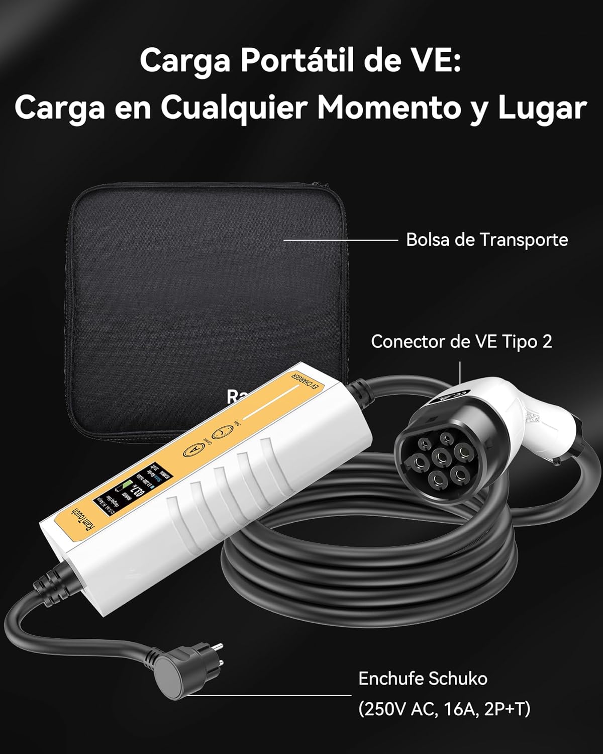 RamTouch Cargador Coche Eléctrico – 3.7kW 6M Tipo 2 a Schuko, Wallbox Portátil con LCD, LED, Ajustable 8-16A, Temporizador, Bolsa, Cargador de Coche EV Compatible con Modelo Y/3/X/S, MG4, 500e, Zoe, ID.3
