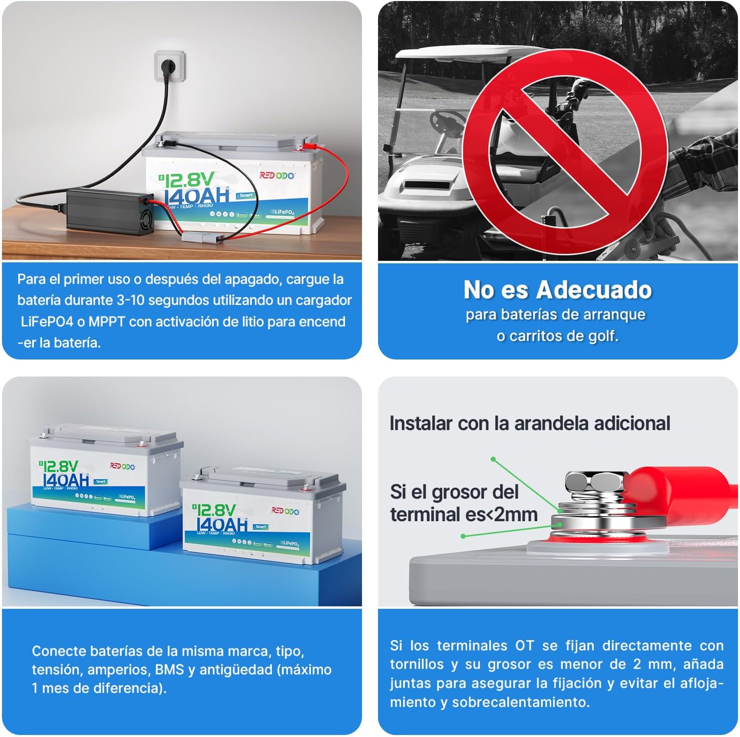 【IMPORTANTE】: ① Esta batería de litio es una batería de almacenamiento, no una batería de arranque, no la utilice como batería de arranque ni en un carrito de golf. ②Si los terminales OT se fijan directamente con tornillos y su grosor es inferior a 2 mm, agregue tornillos a los terminales OT. ③Si se recibe la batería o la batería está apagada, utilice el cargador con función de activación de litio o MPPT para cargar la batería durante 3 a 10 segundos (active la batería).