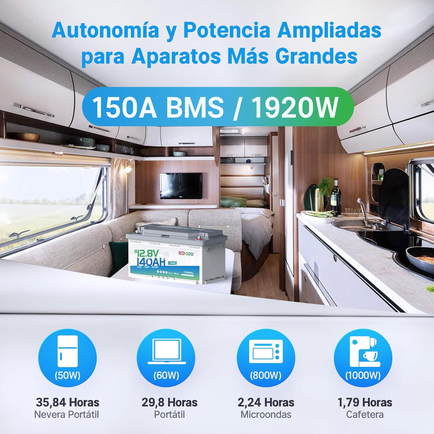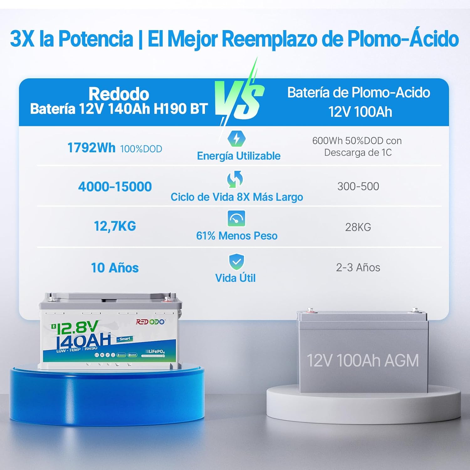 【Peso ligero y mayor capacidad 40%】: La capacidad de la batería de fosfato Redodo 12V 140Ah H190 Bluetooth LiFePO4 se ha mejorado en comparación con la batería de fosfato Redodo 12V 100Ah H190 Bluetooth con el mismo volumen pero un 40% más de capacidad para una mejor autonomía. Sus dimensiones son L35,8*W17,7*H189cm y su peso es de 13kg, ¡muy adecuado para el espacio debajo del asiento de una caravana europea!