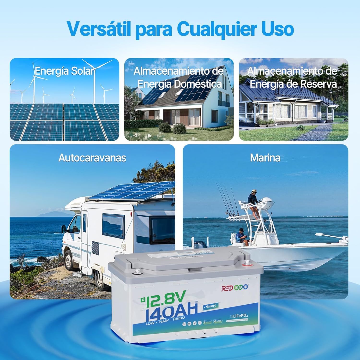 Ampliamente utilizado: la batería de fosfato Bluetooth Redodo de 12 V 140 Ah H190 está diseñada como una batería de almacenamiento para vehículos recreativos, que se puede utilizar en los siguientes campos: camping al aire libre, sistemas de almacenamiento de energía en el hogar, vehículos recreativos, remolques, motores de pesca por curricán, energía de respaldo en el hogar, sistemas de energía solar, fuera de la red, etc.