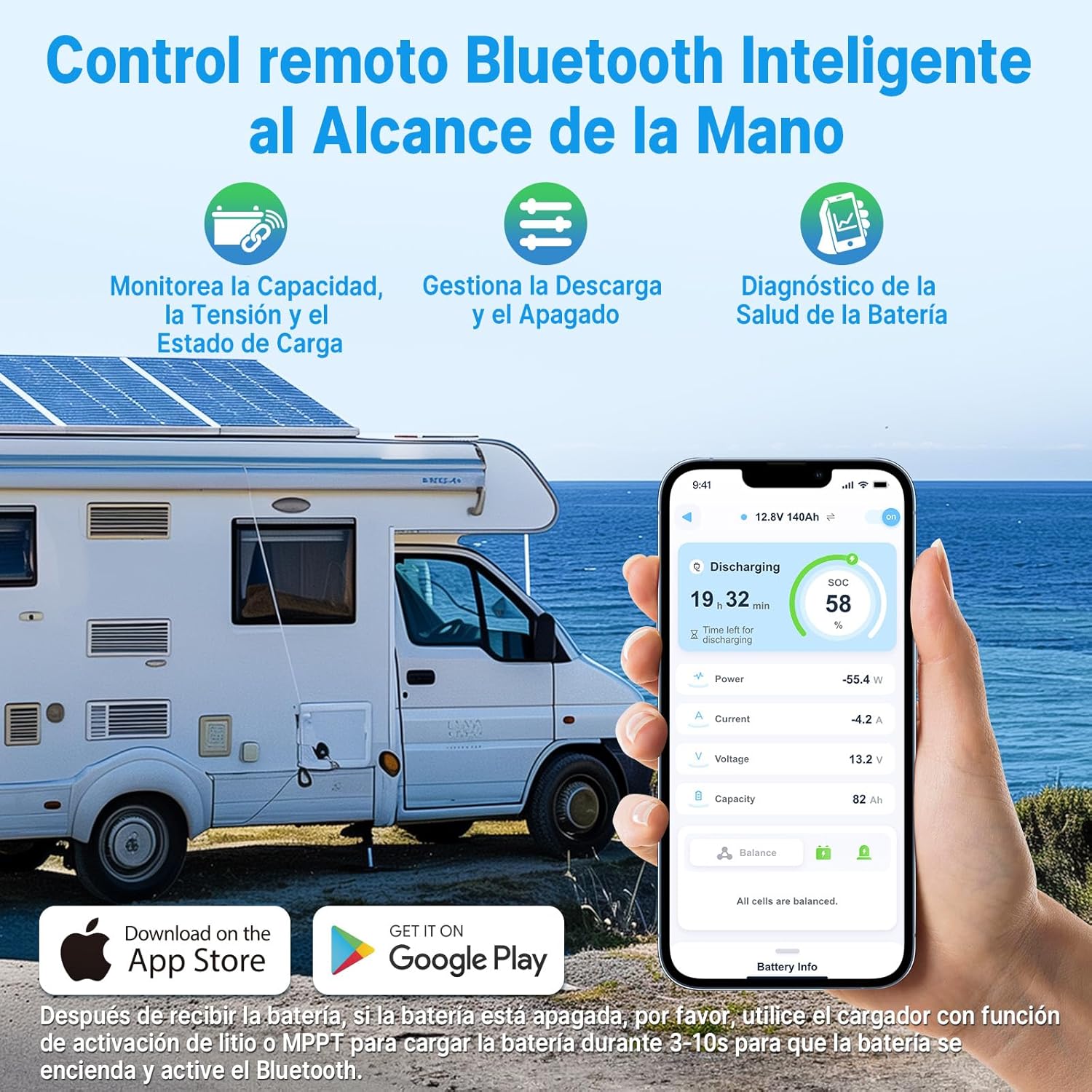 【BMS 150A agregado】Esta batería de litio Blurtooth está equipada con un BMS avanzado de 150A ①El BMS agrega una función de precarga para evitar problemas de arranque del inversor cuando la capacidad de la batería no es suficiente para iniciar el inversor, que se puede aplicar a todos los inversores del mercado. ② El BMS está equipado con una función de autorreparación para protección contra sobrecargas, no es necesario desconectar la carga y volver a conectar la batería. ③ Mayor resistencia a la humedad y a la niebla salina de las placas BMS, lo que reduce el riesgo de corrosión de las placas y mejora en gran medida el rendimiento de la batería en entornos húmedos.