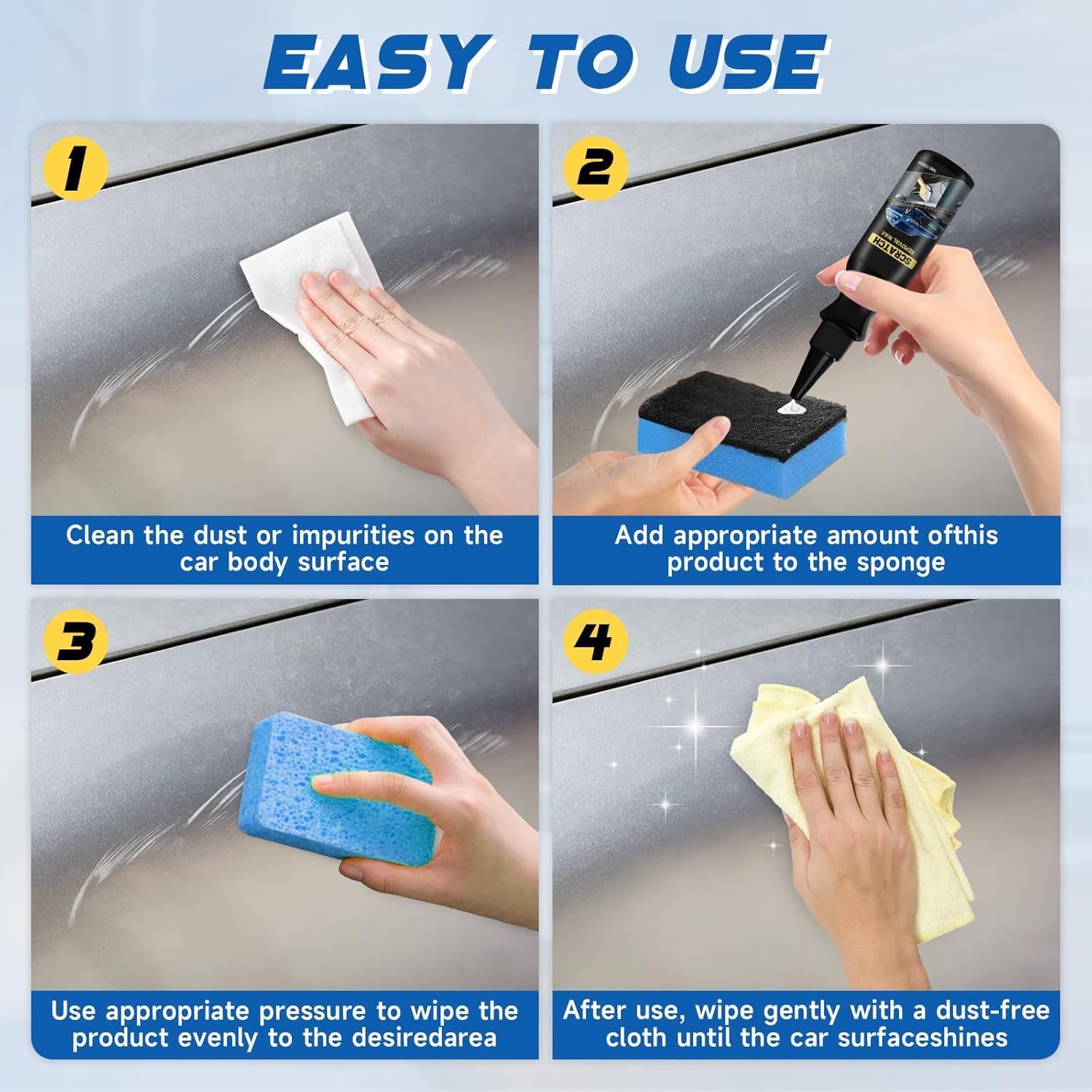 FÁCIL DE USAR: simplemente limpie el área del rasguño y elimine la suciedad, la cera y otros. Exprime suficiente crema sobre el bizcocho. Utilice la esponja para frotar el rasguño hasta que desaparezcan. Luego limpie la crema.