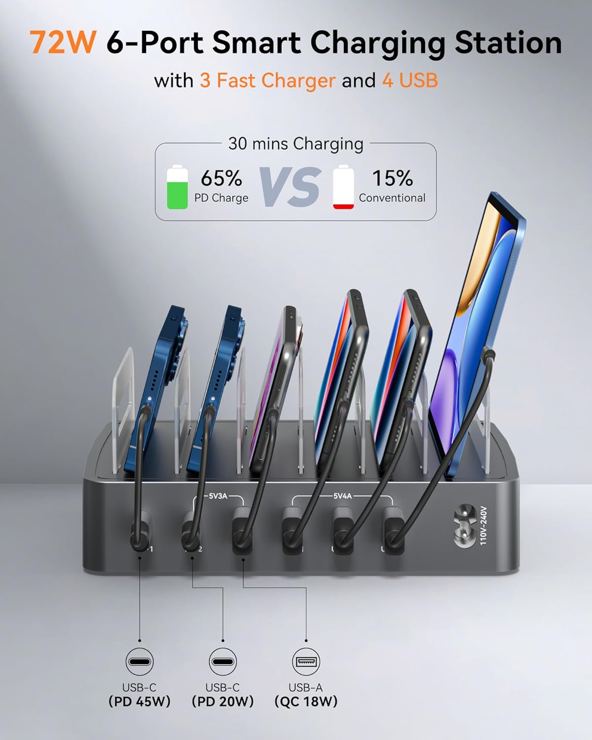 RENGOGA Estación de Carga USB C 72W a 6 Puertos para Múltiples Dispositivos, Carga Rápida PD 45W para iPhone 14/13, 2X USB-C y 4X USB-A, Sin Cables de Carga, para Smartphones Tabletas AirPods