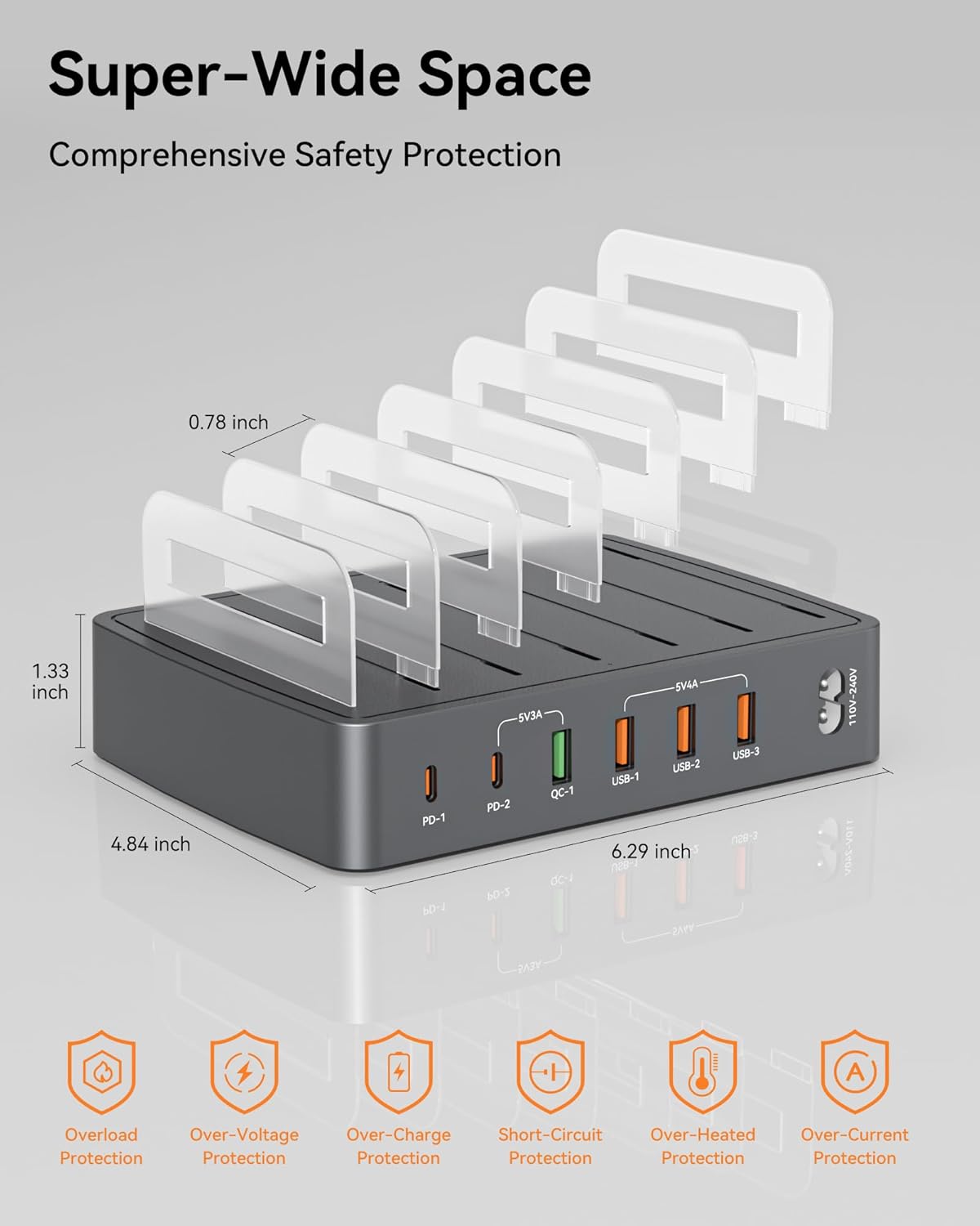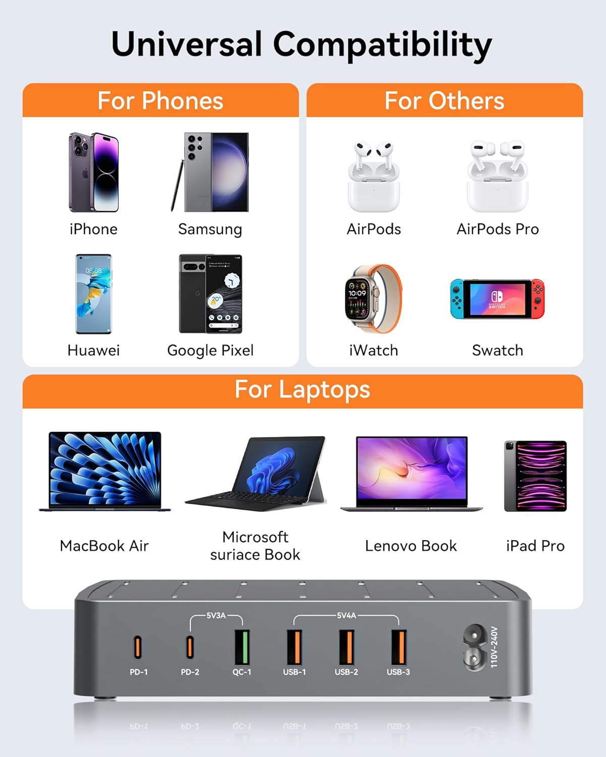 【Carga segura, confiable y eficiente】Diseñada con múltiples características de seguridad que incluyen protección contra sobrecarga, sobrecorriente y cortocircuito, esta estación de carga garantiza que sus dispositivos se carguen de forma segura. Su diseño duradero y elegante lo hace elegante y funcional, mientras que el cable de alimentación y el manual del usuario incluidos ofrecen comodidad adicional.