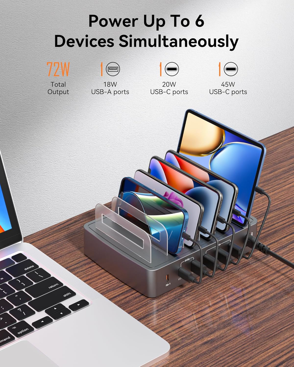 【Salida total de 72 W para cargar múltiples dispositivos】Con una salida total de 72 W, esta estación de carga garantiza que todos sus dispositivos se carguen rápidamente. Ya sea su teléfono, tableta o parlantes portátiles, esta estación puede manejar todo con facilidad, reduciendo el tiempo de carga y manteniendo ordenado su espacio de trabajo.