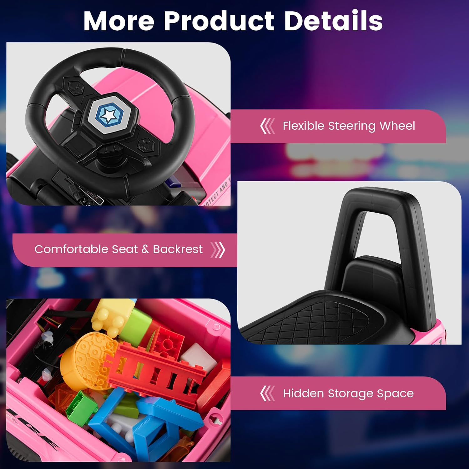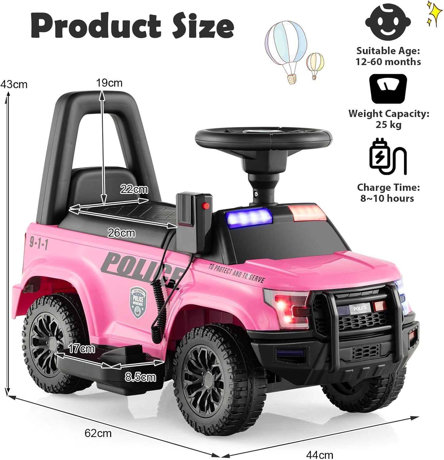 Este coche de juguete para niños está equipado con bonitas pegatinas de coche de policía, luces de advertencia intermitentes y un altavoz, para que los niños se sientan como en el mundo real de la policía. Los niños pueden presionar el botón rojo del altavoz para amplificar el sonido y divertirse aún más. El asiento múltiple puede soportar hasta 25 kg. Además, los niños pueden guardar juguetes, bocadillos y otros artículos pequeños en el espacio de almacenamiento debajo del asiento. Este coche de juguete para niños está equipado con un dispositivo antivuelco y un respaldo de seguridad que evita que los niños se recuesten, garantizando así su seguridad. Los niños no sólo se divierten jugando, sino que también entrenan su equilibrio, su motricidad y su coordinación ojo-mano.