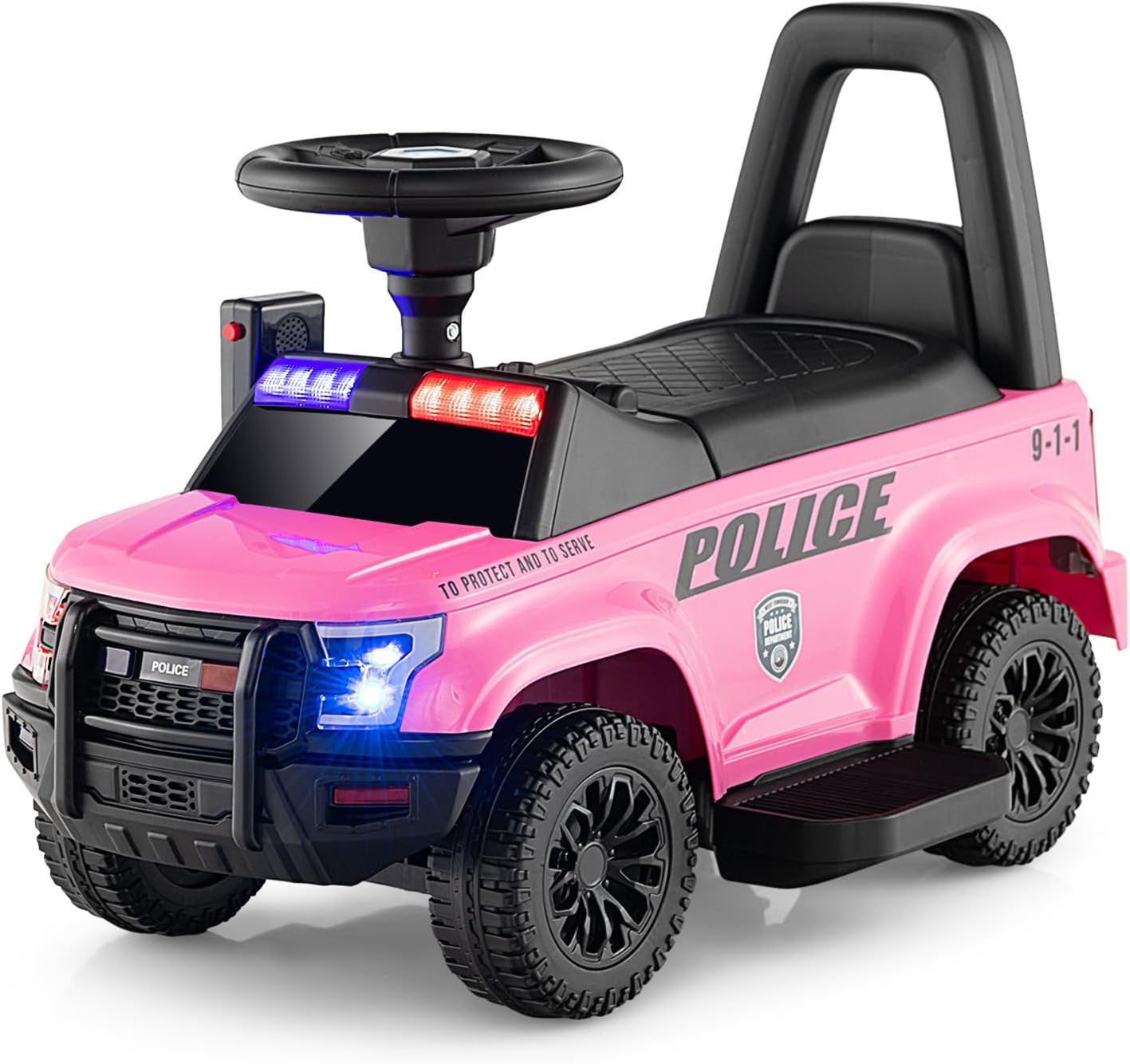 SOARS Coche de policía eléctrico para niños de 6 V con sonido de sirena, luz de advertencia de megáfono, coche eléctrico con pedales para niños y niñas a partir de 1 año (rosa)