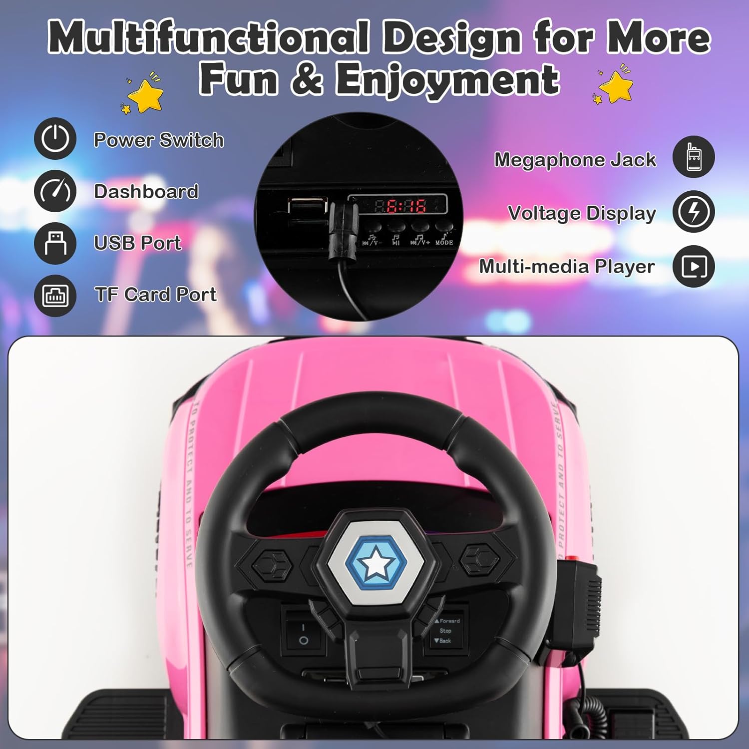 Exquisitas pegatinas policiales, sonido de alarma, luces de advertencia realistas y parlantes.