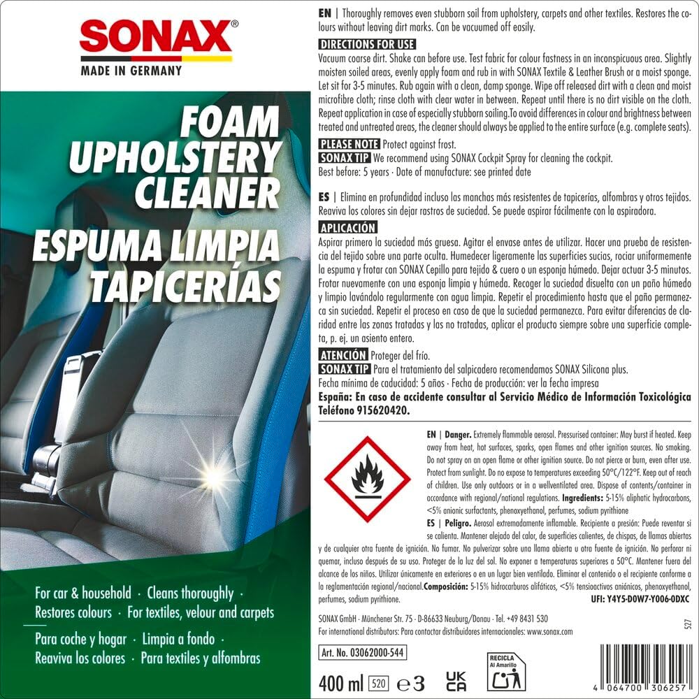Quality guaranteed Made in Germany, SONAX stands for excellence for over 70 years. Box contents: 1 x SONAX foam cleaner for upholstery and carpets (400 ml) | No. 03062000-820