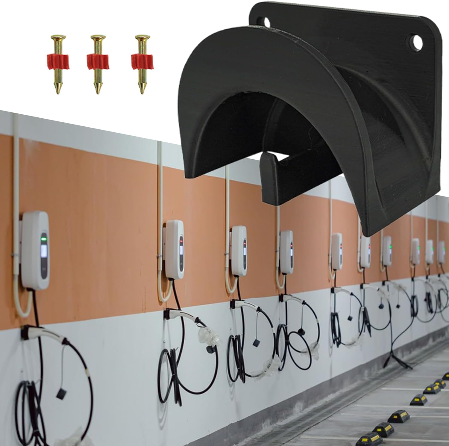 OPTIMIZACIÓN DEL ESPACIO – Diseño compacto con 5 ranuras de fijación ajustables. Permite organizar hasta 4 cables de carga simultáneamente ahorrando espacio en la pared. Compatible con la mayoría de modelos de terminales de carga.