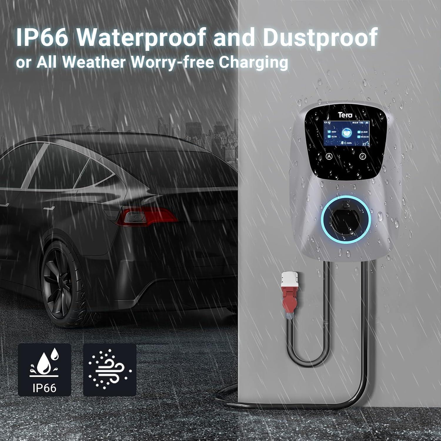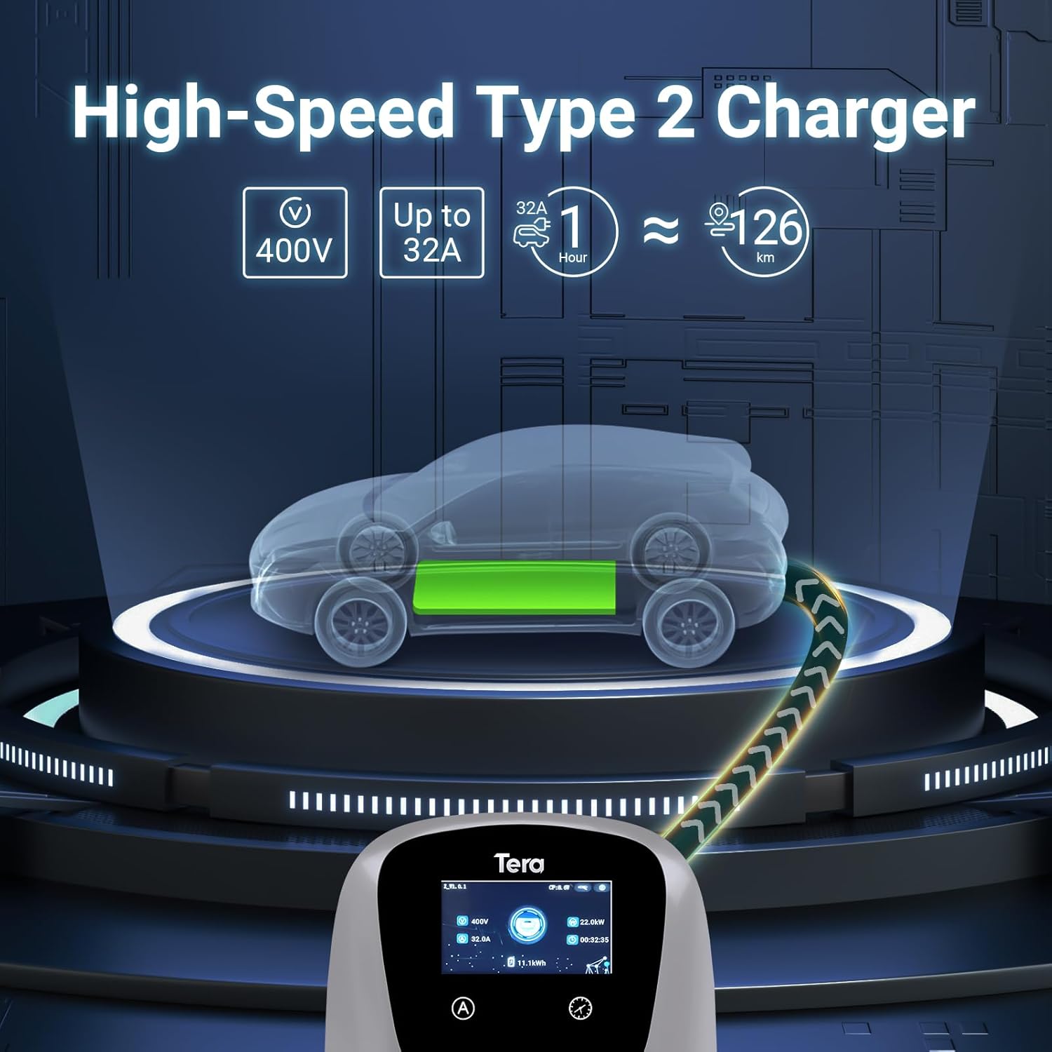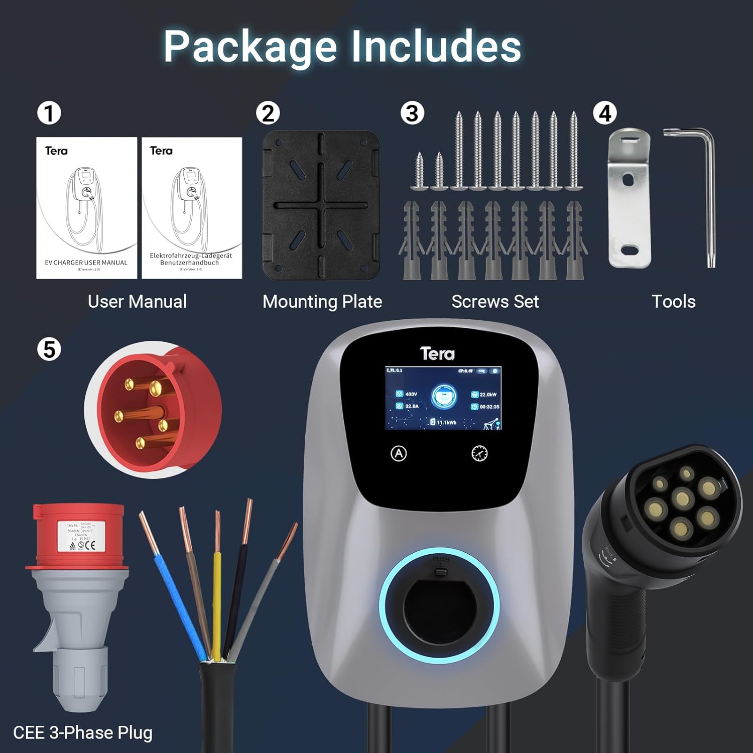 Tera Cargador EV con Smart App 32A Tipo 2 22kW 400V CE y TüV Wallbox Cable de Carga 7 Metros con Soporte para Cargador Control App Enchufe Trifásico EEC Coche Eléctrico W01