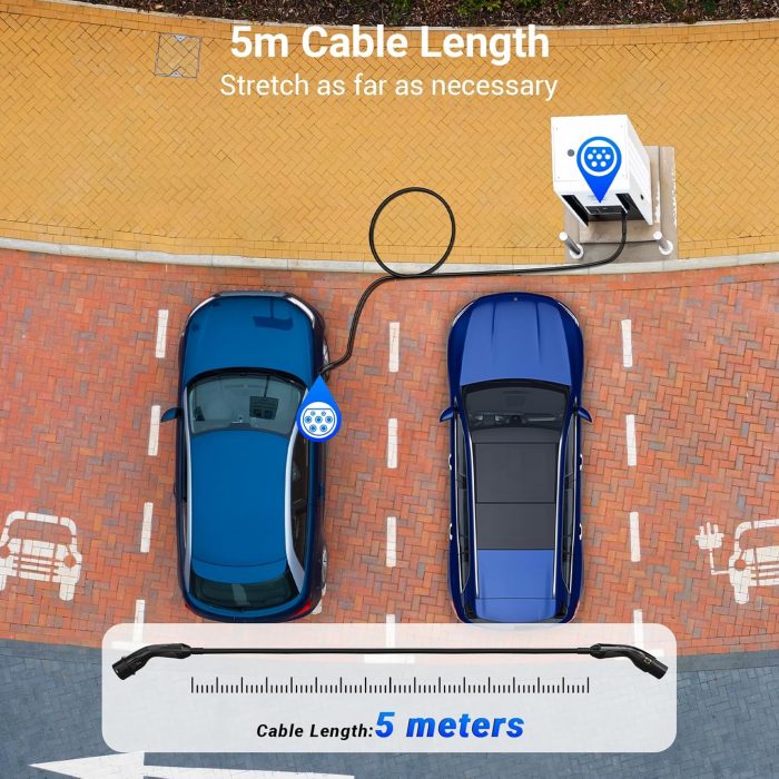 【Convenient Storage, Extra Long Cord】With extremely practical nylon straps and a storage bag for easy and space-saving storage, portable and space-saving. With a cable length of 5 meters, you can charge your vehicle easily even if it is parked far away and you don’t have to worry that a cable too short will prevent charging.